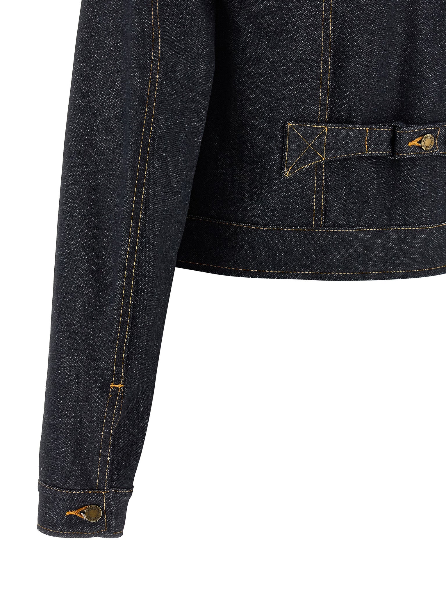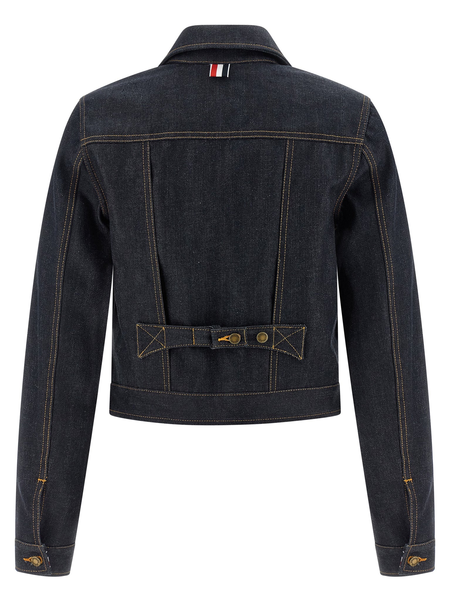 Japanese Selvedge cotton denim jacket with contrast stitching, crop style, shirt collar, button closure, pockets, long cuffed sleeves and grosgrain RWB ribbon lining, adjustable strap at the back. Size and Fit - shrunken fit