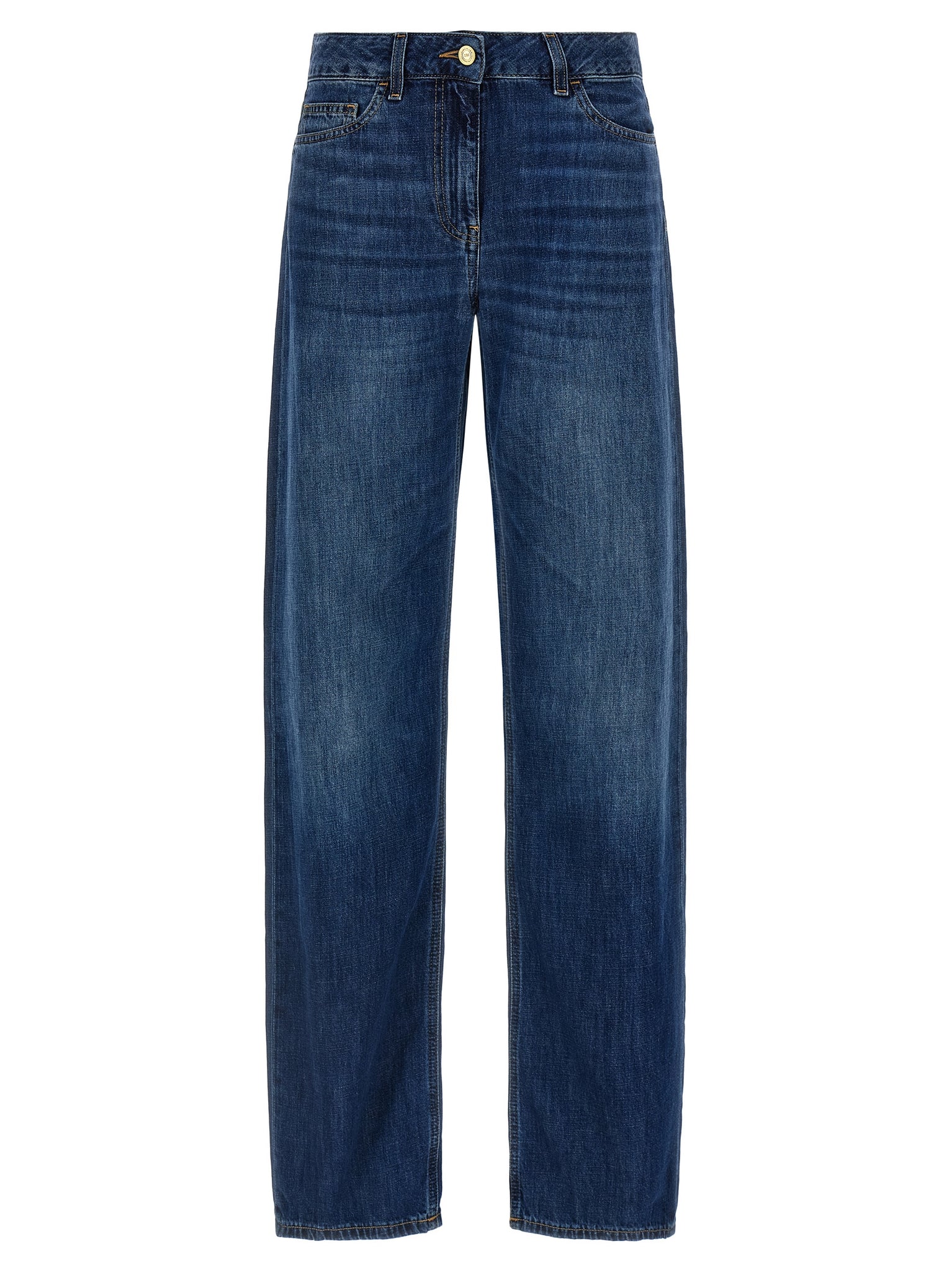 Stonewashed cotton denim jeans with low waist, Wide palace leg, Back logo embroidery, Front zip and button closure, Five pockets. Size and Fit - true to size fit