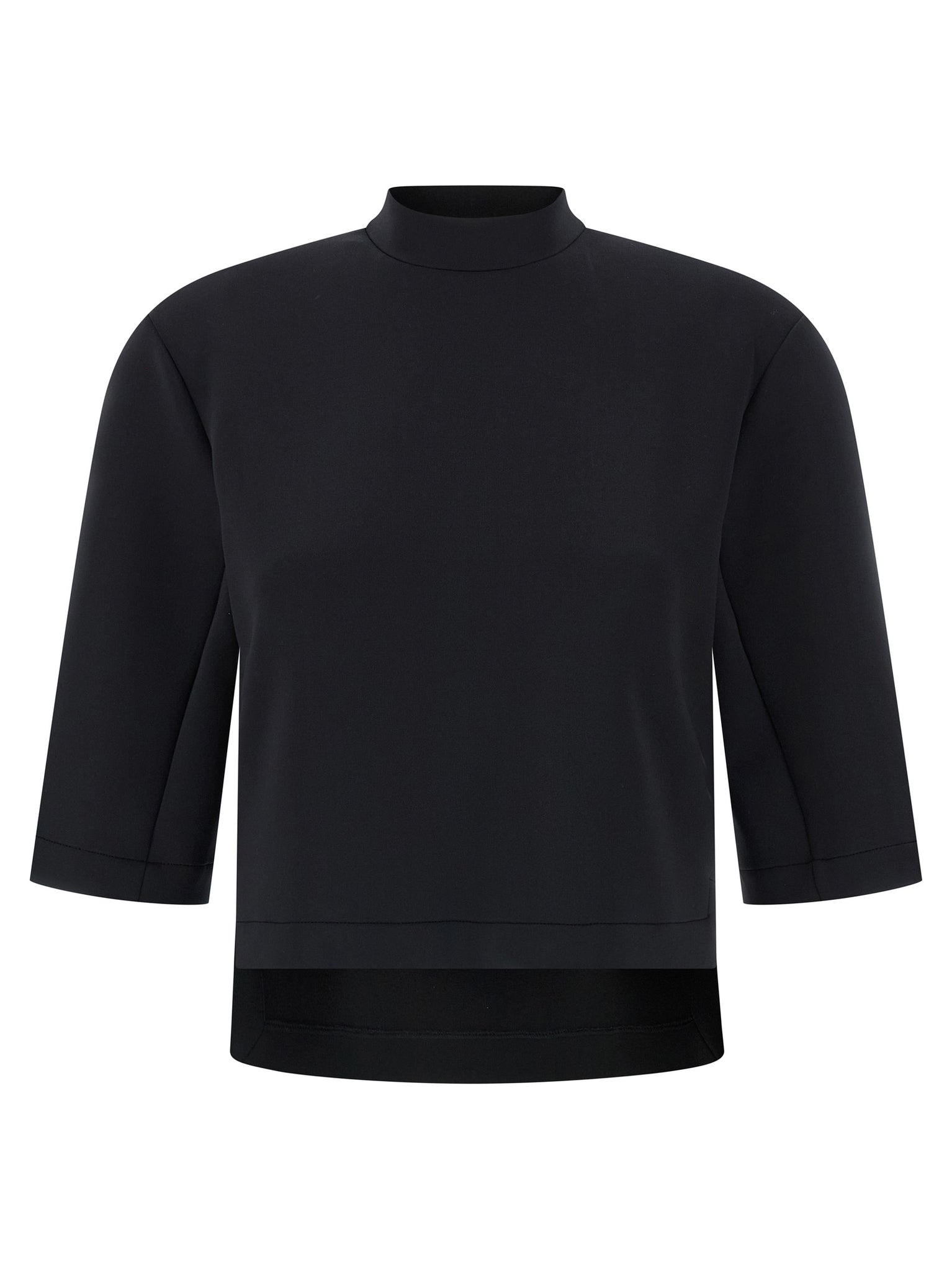 Moncler x edward enninful top in scuba-effect fabric, Crop model, High neck with tone-on-tone logo patch at the back, Short sleeves, Side slits, And asymmetrical hem. Size and Fit - true to size fit