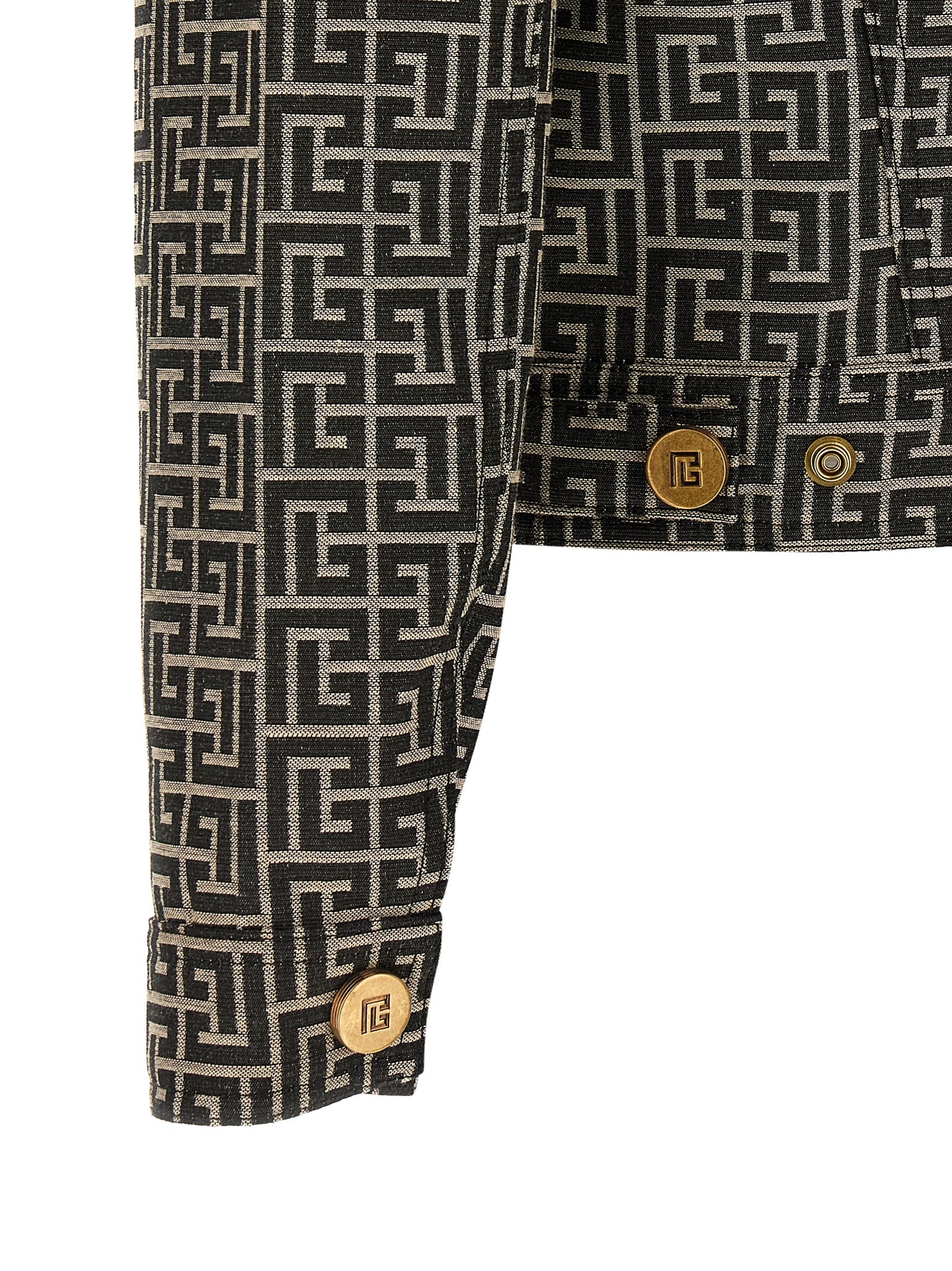 Monogram jacquard jacket with shirt collar, front metal button closure, pockets, long cuffed sleeves, unlined. Size and Fit - true to size fit