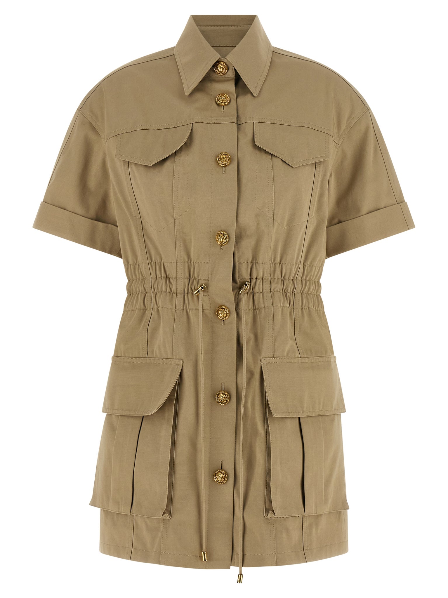 The Balmain Saharan Dress is a green cotton gabardine mini that balances utility with tailored polish, featuring a pointed shirt collar, metal 'testa di leone' front buttons and practical pockets for everyday wear. An elastic waist with drawstring and short sleeves with dropped shoulders create a comfortable, adjustable fit while lined construction ensures smooth layering. True to French sizing, this piece offers a structured silhouette that transitions easily from day to evening. Designed for adult women, it reflects Balmain's attention to couture detailing and functional design.