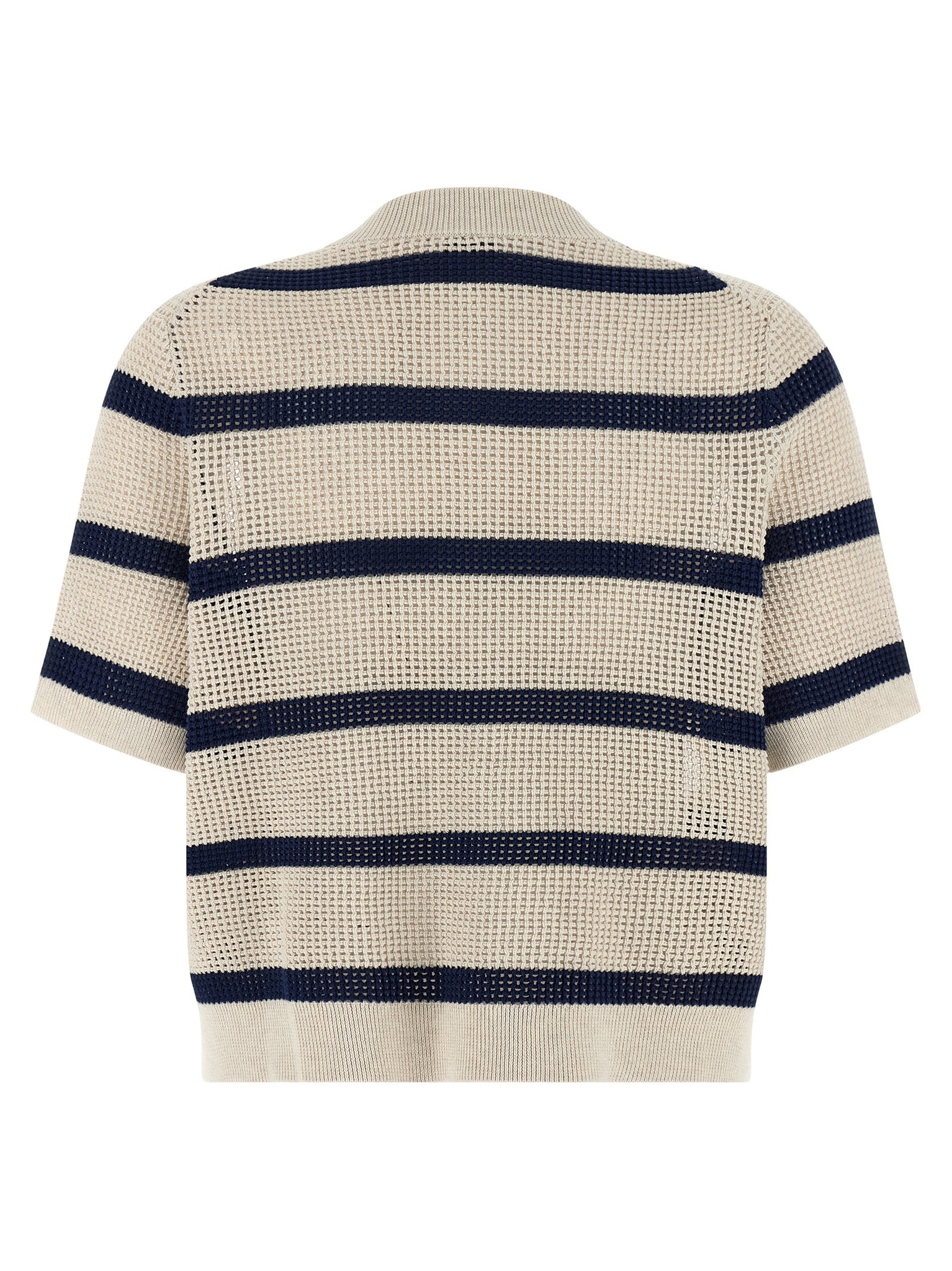 Striped cotton cardigan with mesh pattern, crew neck, front button closure, pockets, short sleeves with cuffs, band on the hem. Size and Fit - true to size fit