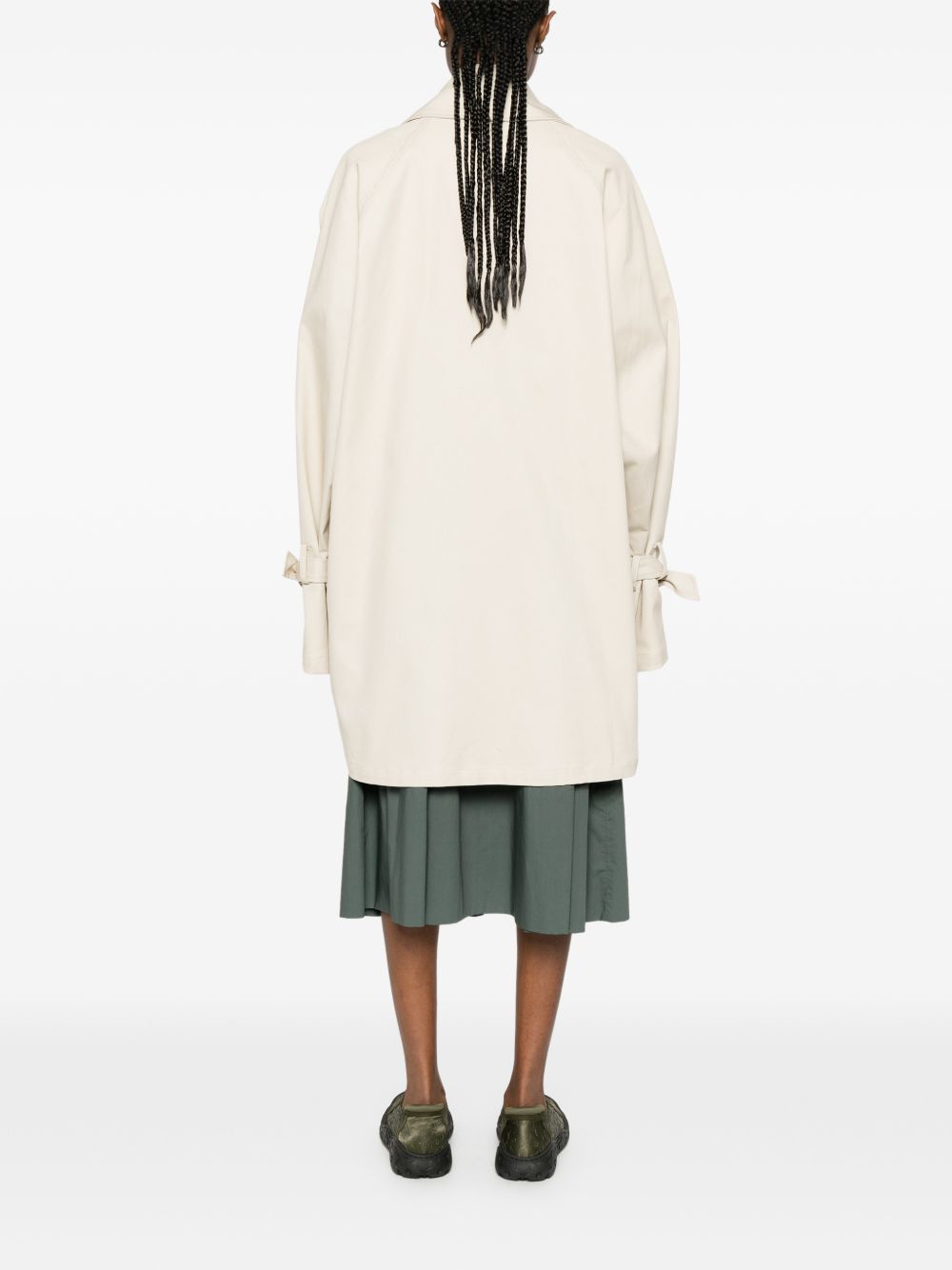beige floral print tie cuffs lapel collar open front Cotton caban coat