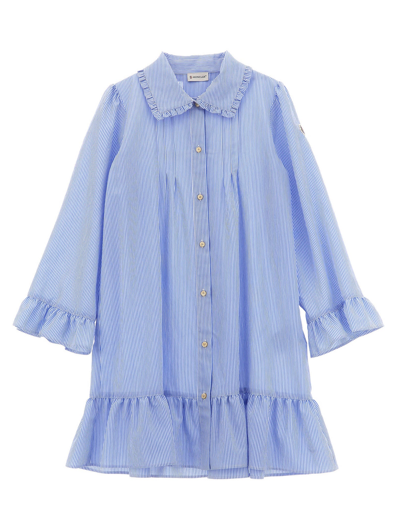 This light blue Moncler Enfant striped chemisier offers a polished silhouette with a ruffle collar and cuff detailing that elevate everyday wear. The viscose blend drapes comfortably while mother-of-pearl buttons provide a refined closure and the felt logo patch on the sleeve signals authentic branding. Designed for a true-to-size fit, it balances easy movement with a tailored appearance suitable for multiple occasions.
