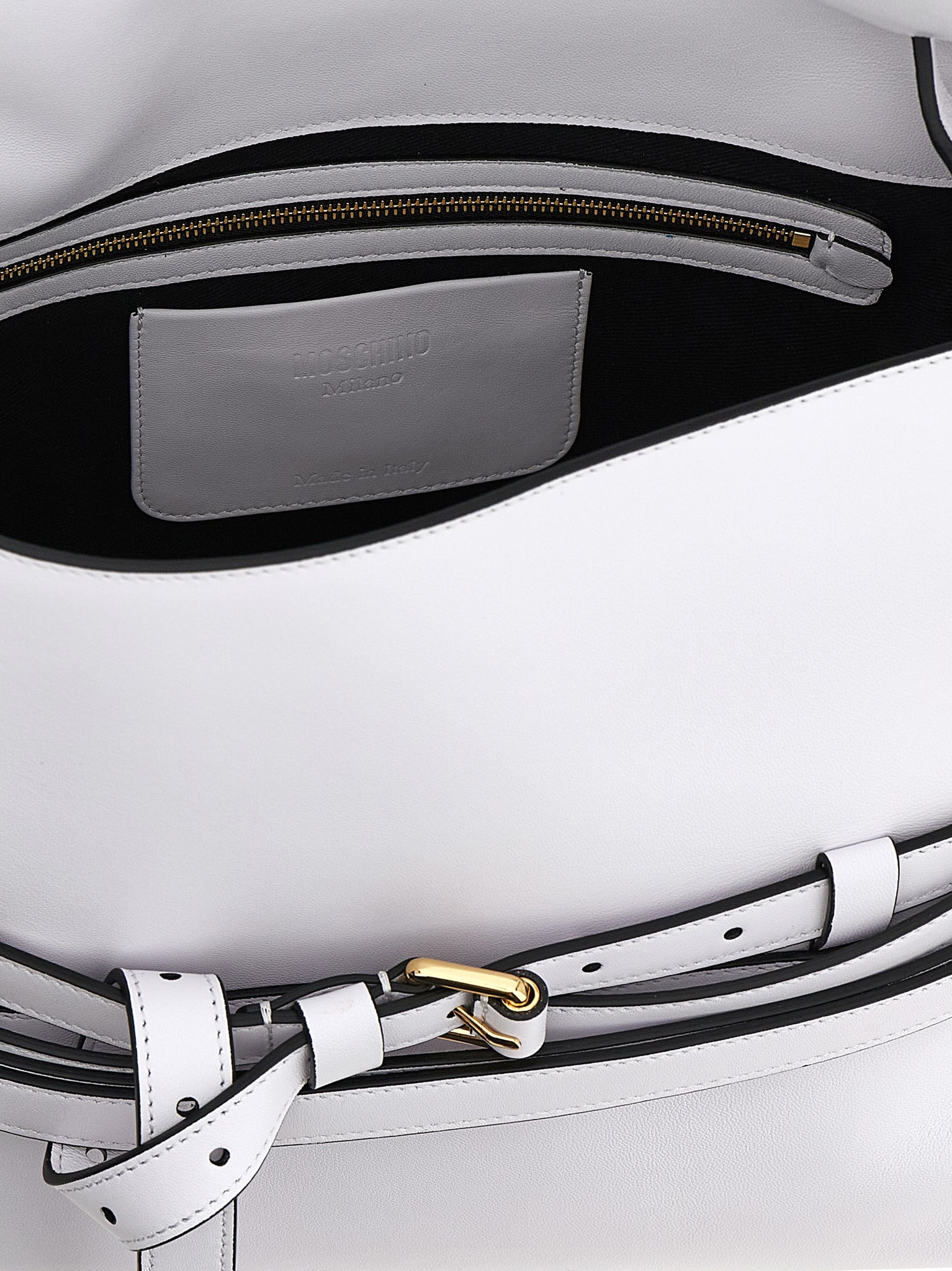 Tie Me' pekke shoulder bag with front belt detail, front embossed logo, fixed handle, magnetic flap closure, adjustable and removable leather shoulder strap. Size and Fit - W 38.5 x H 28.5 x D 14 cm