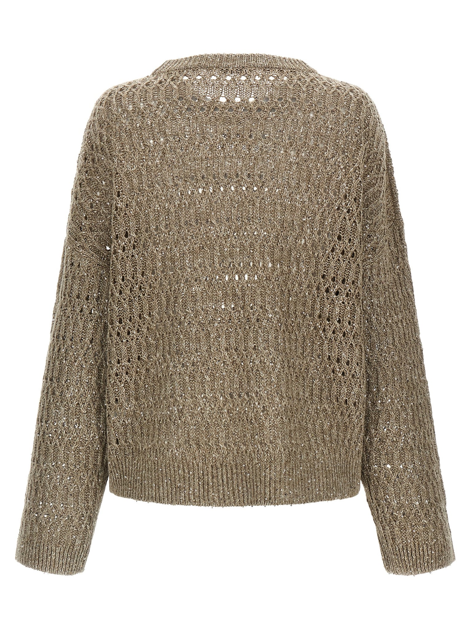 Knitted perforated linen sweater with all-over micro sequin application, crew neck, long sleeves with cuffs and dropped shoulder, band on the hem. Size and Fit - Comfort fit