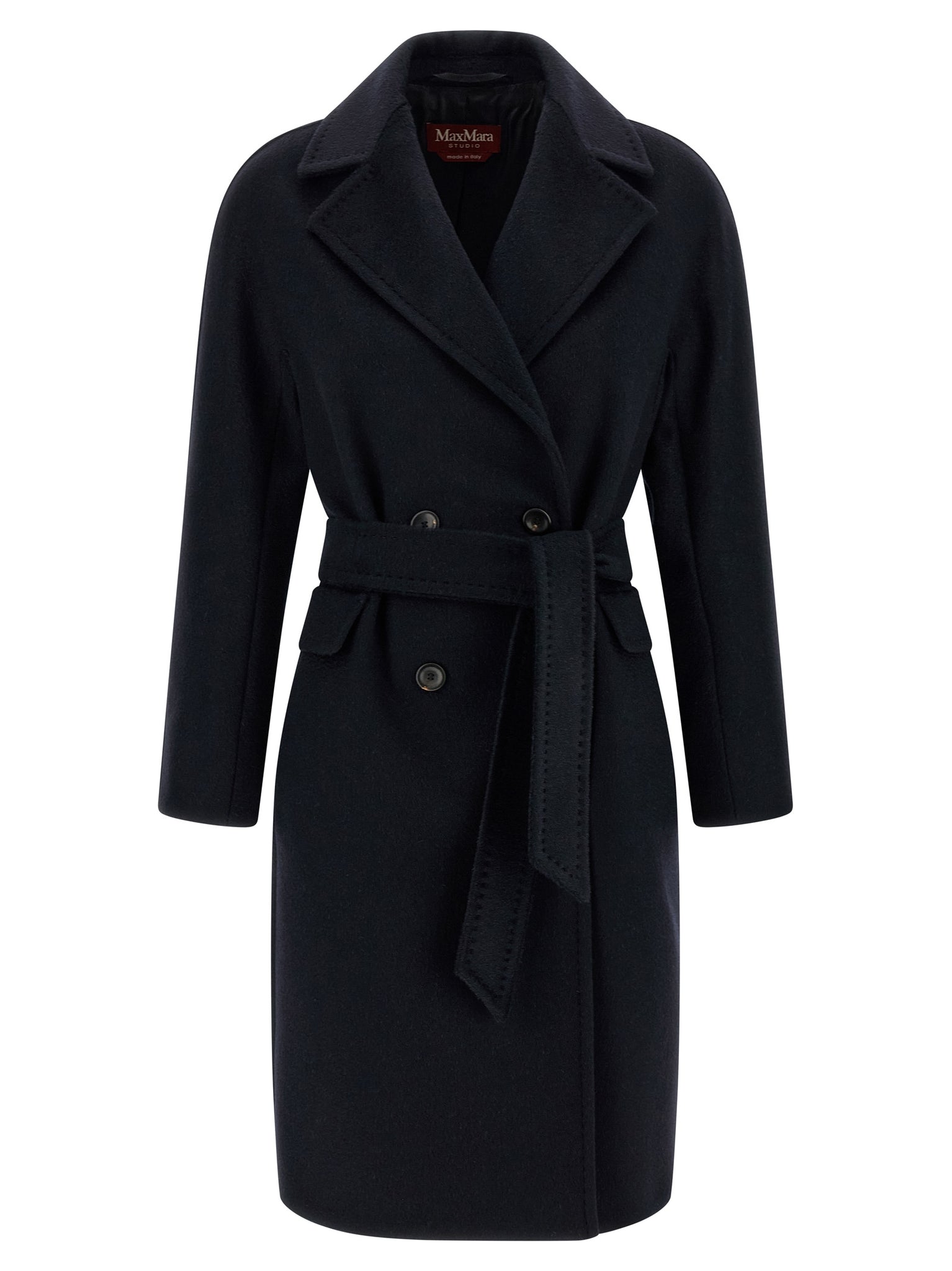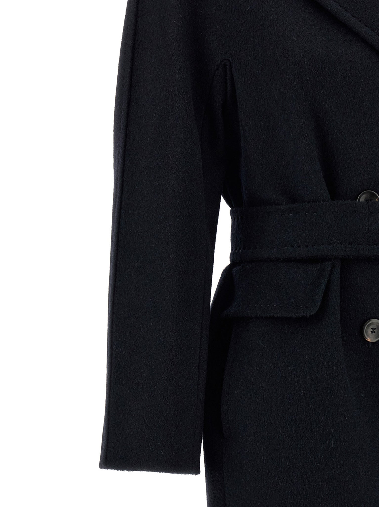 'Panteon' midi coat in pure cashmere, alpaca and wool sable drap with double-breasted button closure and lapel collar, pockets, long kimono sleeves, viscose lining, removable belt. Size and Fit - true to size fit