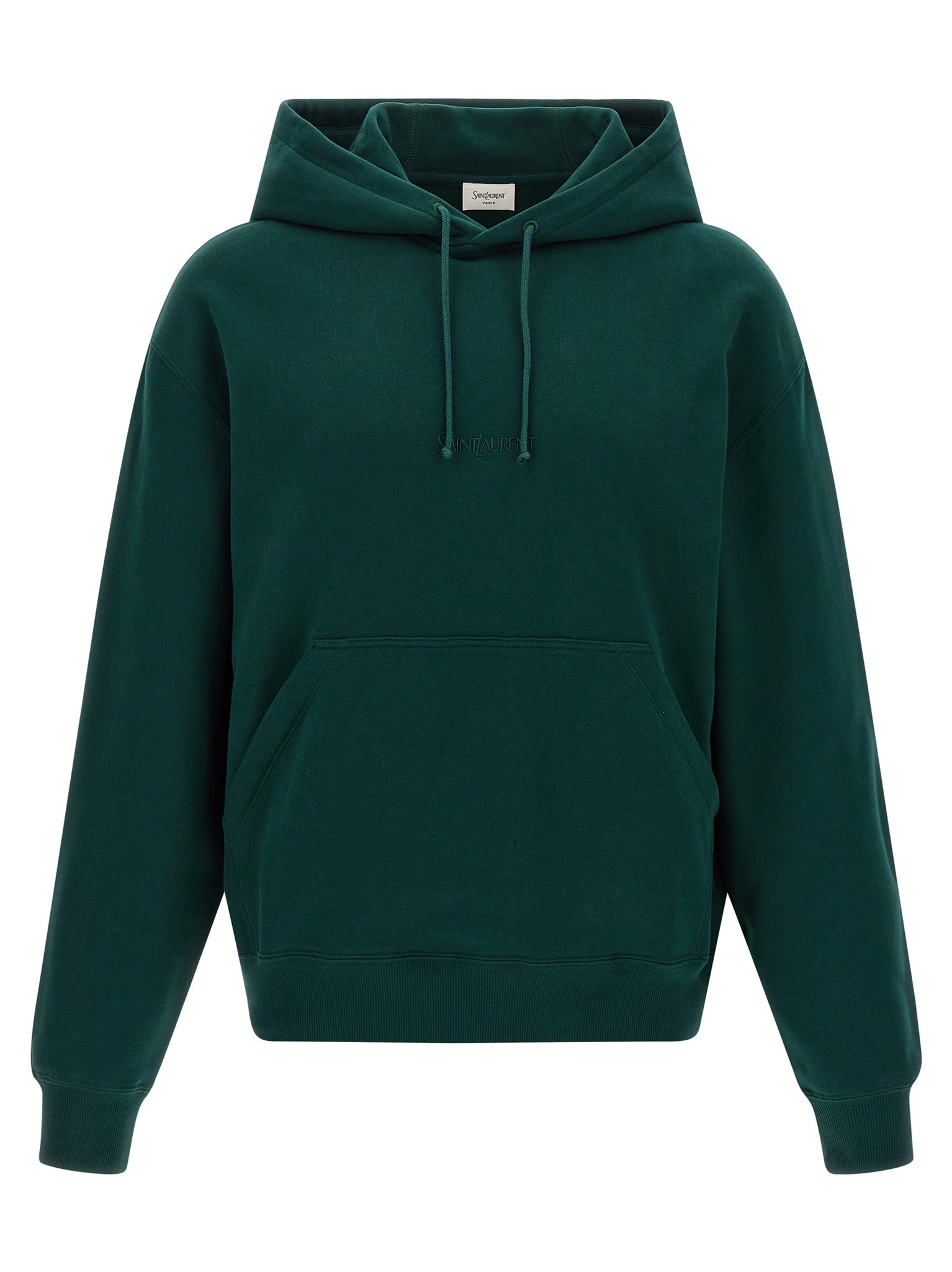 Fleece cotton hoodie with tonal 'Saint Laurent' embroidery on the front, kangaroo pocket, long cuffed sleeves and dropped shoulders. Size and Fit - true to size fit