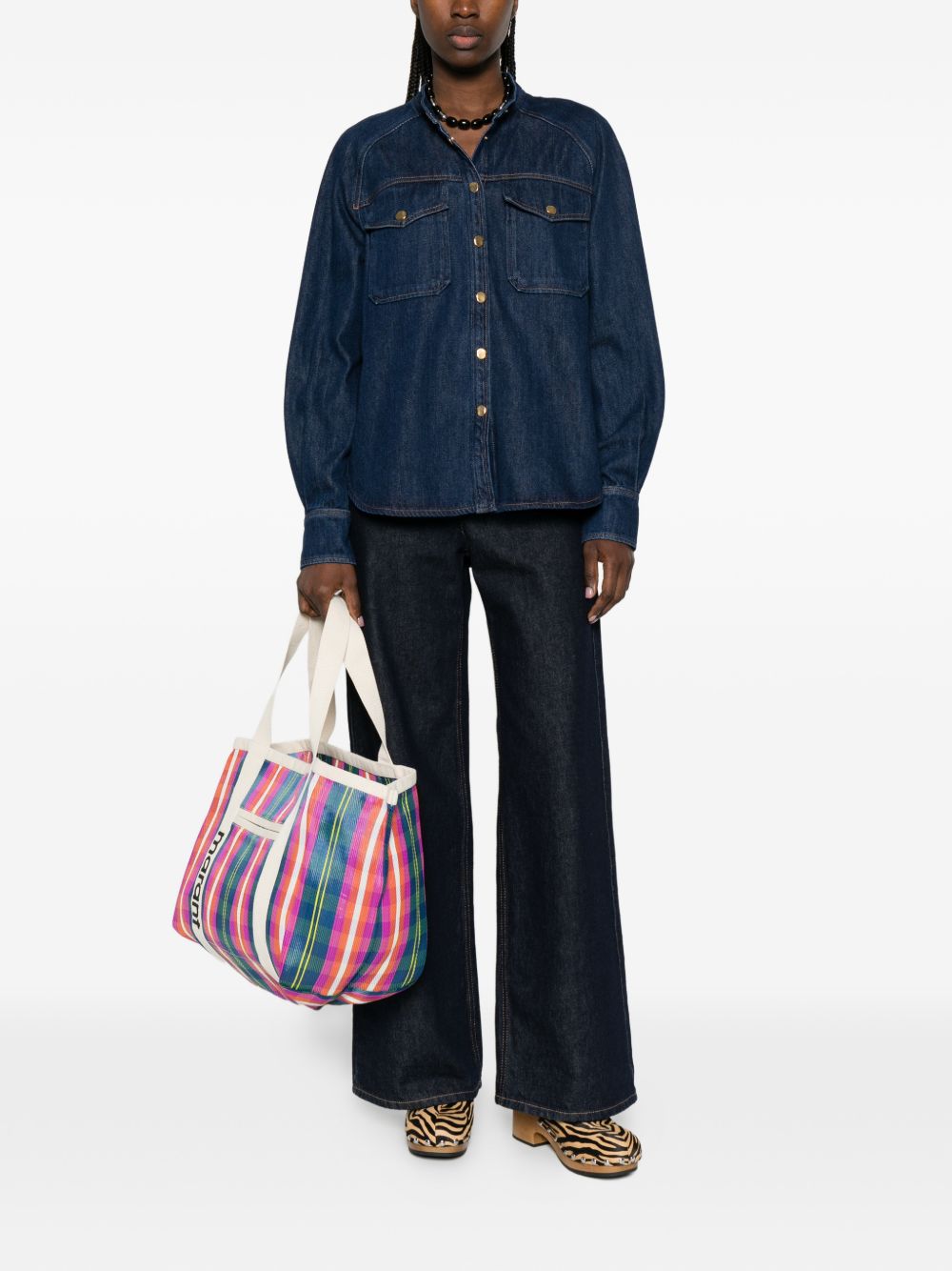 blue gold-tone hardware button fastening curved hem long sleeves chest pockets Denim cotton shirt