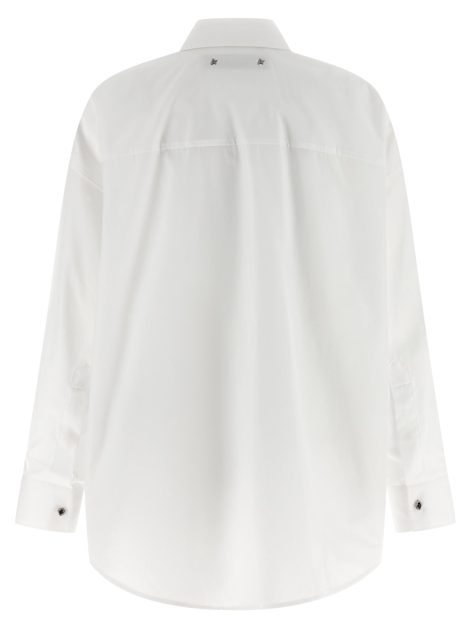 Discover the oversized white cotton poplin Journey Shirt from Golden Goose that balances relaxed tailoring with refined details for an elevated everyday silhouette. Its front plastron, concealed mother-of-pearl button closure and jewel button at the neck provide a polished look while long sleeves with jewel button cuffs, side slits and an asymmetric hem add movement and modern proportion. The back metal logo offers a subtle brand accent and the roomy fit layers easily over knitwear or a camisole.