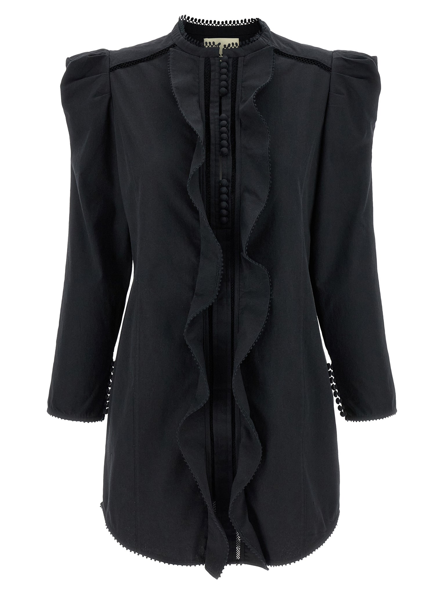 Victorian cotton mini 'chantal' dress with ruffle inserts, Mesh fretwork and crochet finish, Crew neck, Front button closure, Long puff sleeves with buttons and slit on the sleeve bottom. Size and Fit - slim fit - FRENCH size