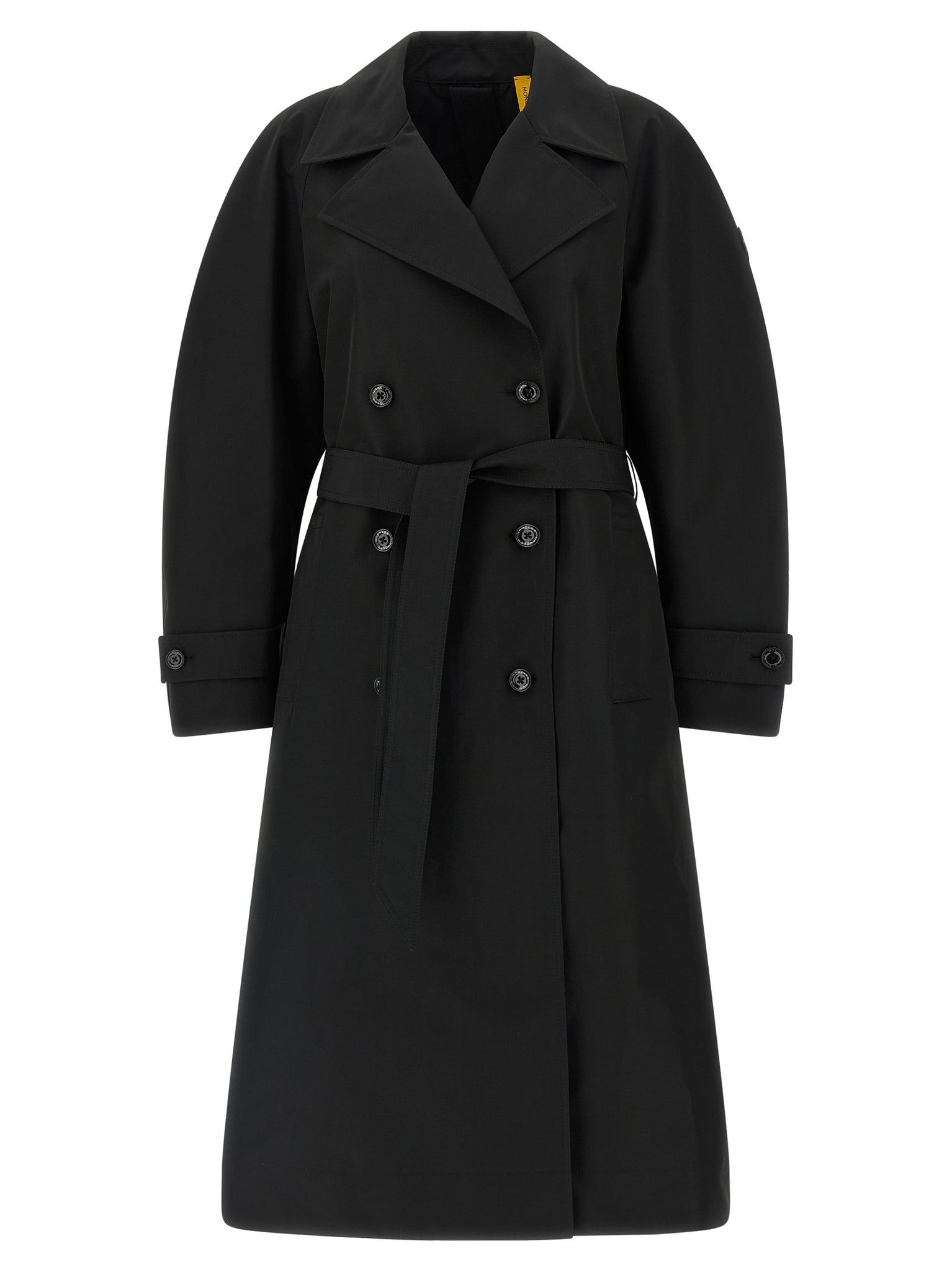 Moncler x edward enninful 'zake' trench coat in water-repellent technical fabric with lapel collar, Double-breasted style with front button closure, Pockets, Long cuffed sleeves and tone-on-tone logo patch appliqué, Unlined cape and rear yoke, And removable belt. Removable inner backpack braces to carry the garment without using your hands. Size and Fit - true to size fit