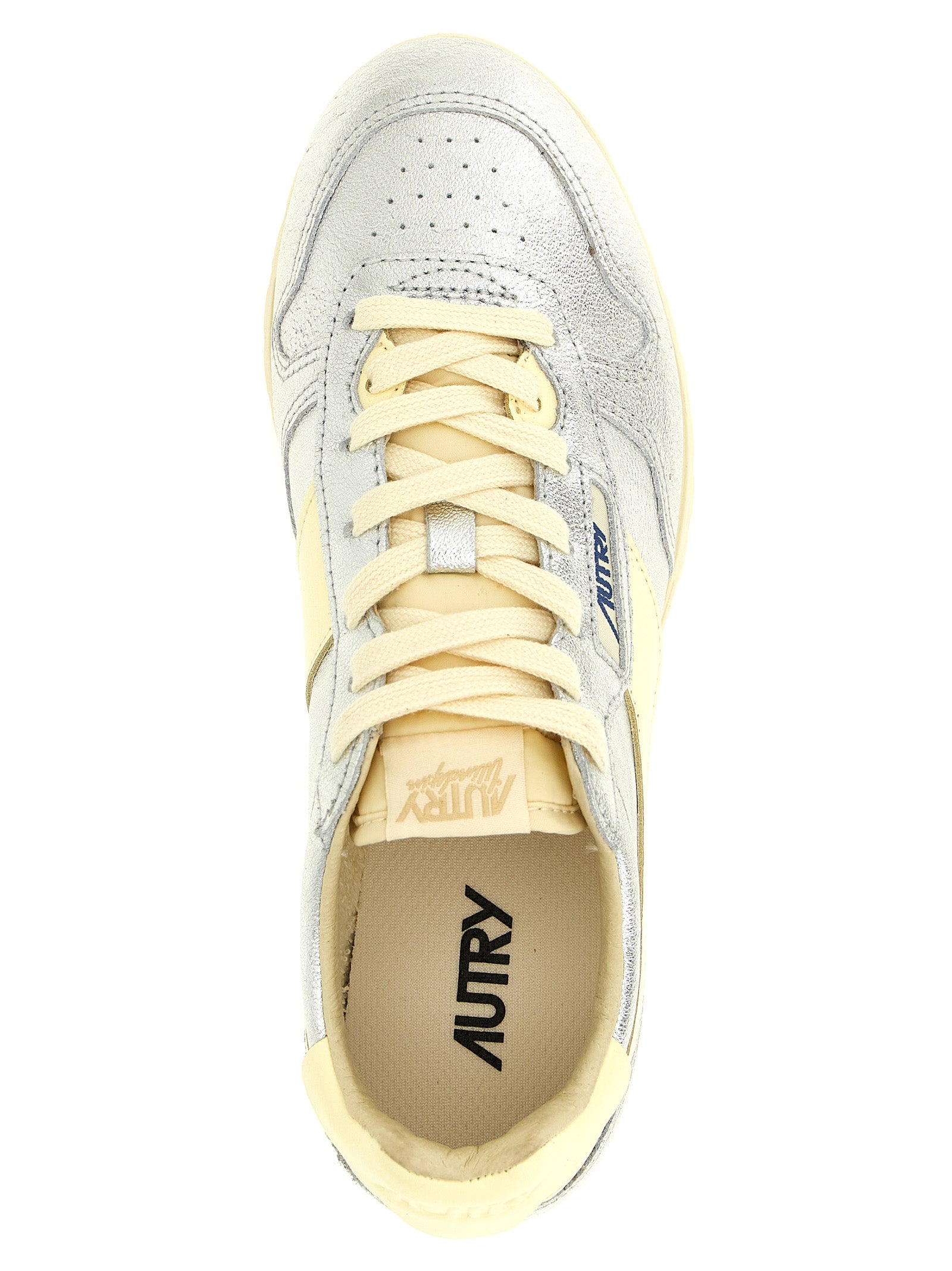 Natural grain laminated leather windspin sneakers with contrasting smooth leather details, Slightly padded nylon tongue and jacquard logo patch, Leather and cotton terry lining, Mesh lined insole, Ultra-flat rubber sole. Size and Fit - EU WOMEN