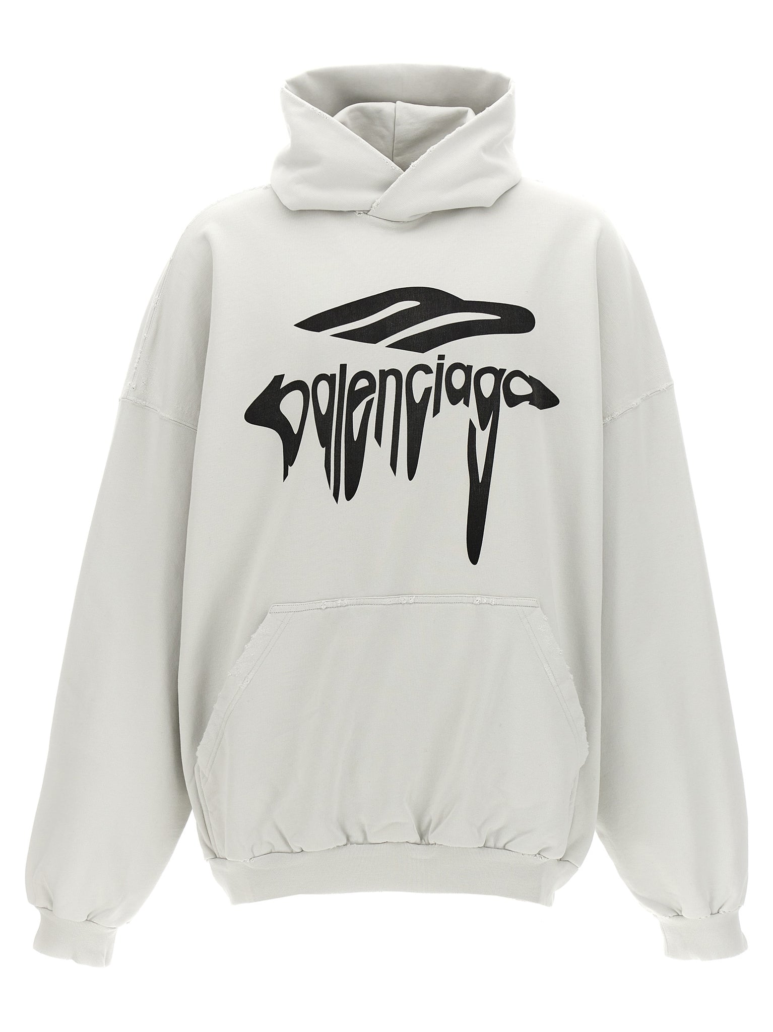 Discover an oversized white cotton jersey hoodie from Balenciaga featuring a used-effect finish and the front '3b liquefied' print that lends a vintage character. Long cuffed sleeves and dropped shoulders create a relaxed silhouette that enhances comfort and layering options. The garment's construction favors easy wear while maintaining designer detailing for a curated wardrobe staple.