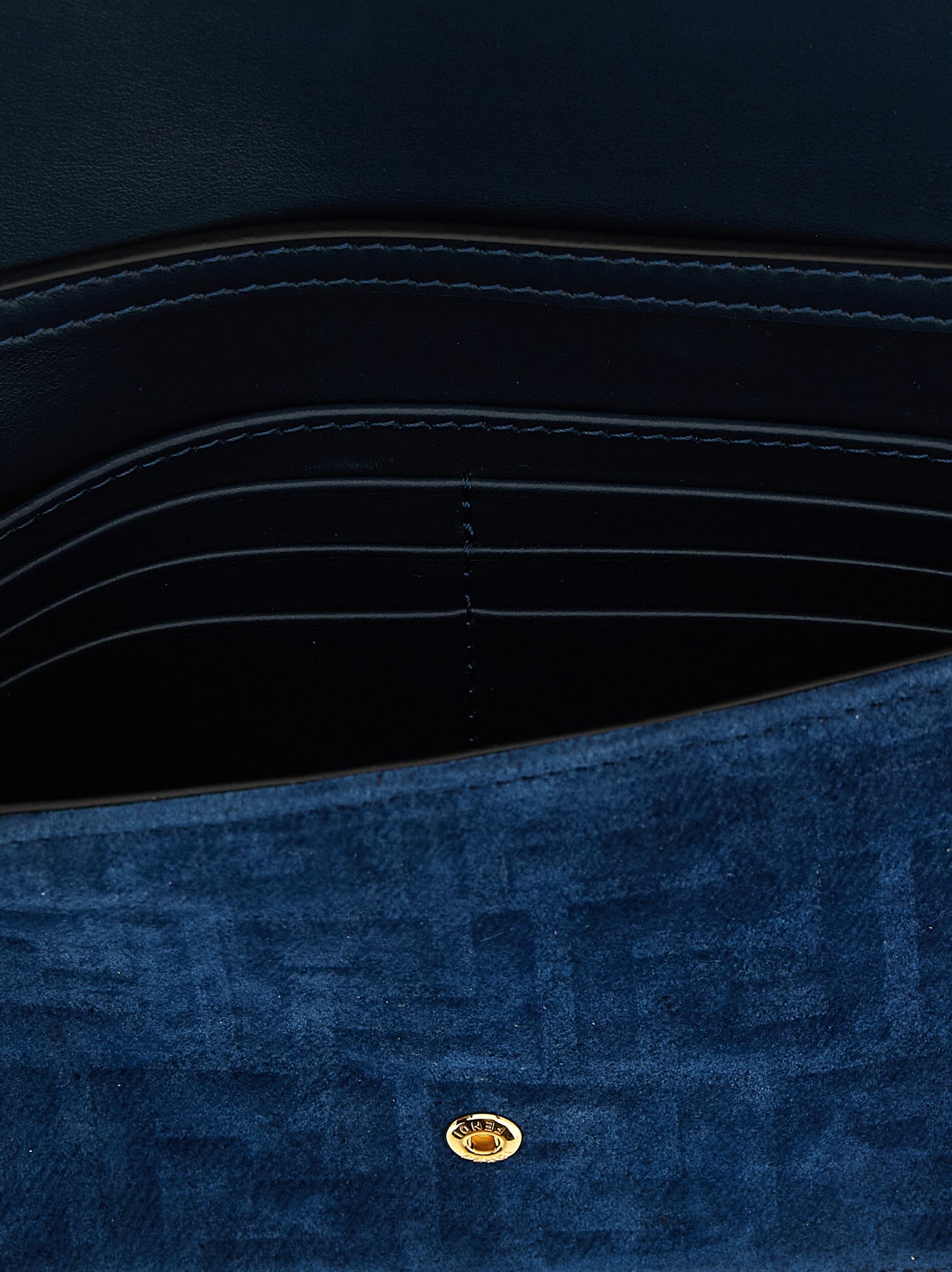 Flocked texture ff denim wallet on chain with tone-on-tone calf leather details, Magnetic flap closure with front metal ff 'baguette' logo, Adjustable and removable short leather shoulder strap, Removable chain shoulder strap. Size and Fit - W 21 x H 11.5 x D 5 cm