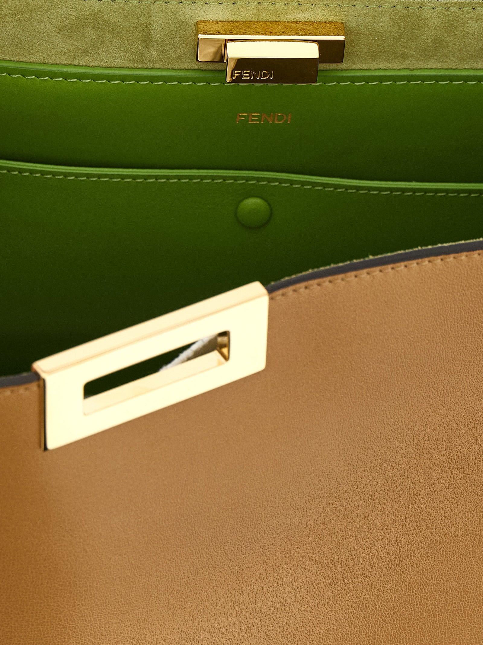 Medium 'fendi way' semi-gloss calf leather handbag with contrast suede lining, Iconic metal swivel closure, Adjustable handle, Rigid base with metal feet. Size and Fit - W 36 x H 27 x D 13 cmMade in: Italy