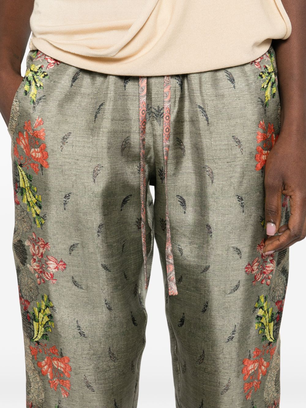 khaki floral print drawstring waist cropped leg side motif Printed silk trousers
