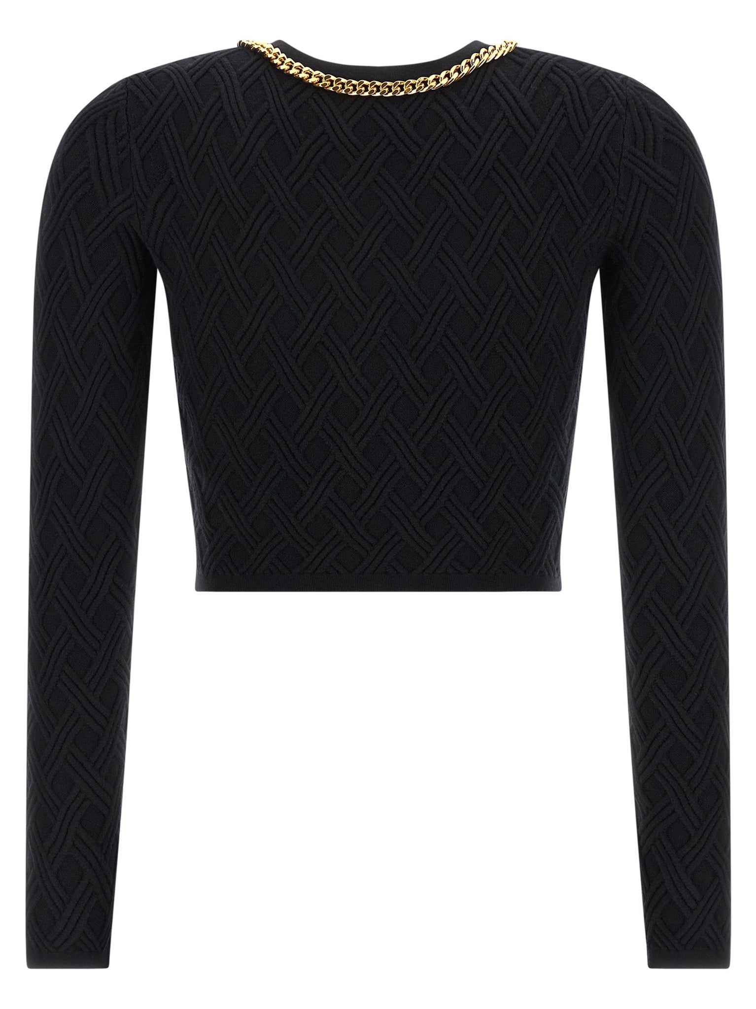 Knit cardigan with 3D diamond processing, crop model, front zip closure with jewel zip puller, crew neck with metal chain detail, long sleeves. Size and Fit - Slim fit
