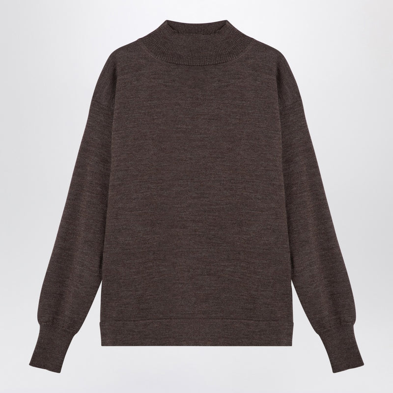 Brown virgin wool sweater from Maison Margiela featuring long sleeves, high collar, ribbed edges and white logo stitching on the back. Size and Fit - Model wears size M Model measurements: Height: 187 cm Chest: 102 cm Waist: 76 cm Hips: 92 cm