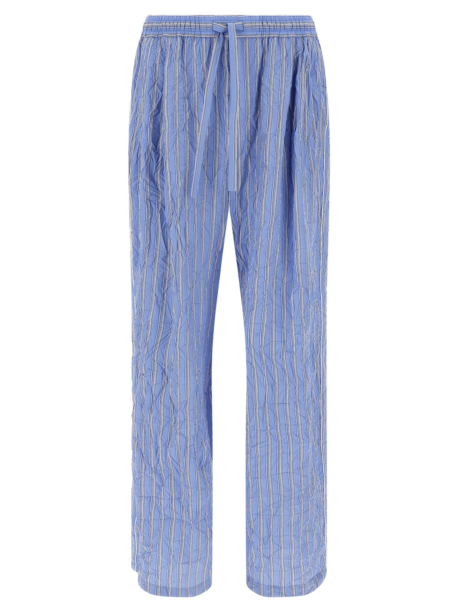 'vanity' pants in cotton and silk blend canvas froissé patterned striped, Pajama model, Wide and straight leg, Drawstring elastic waistband, Trompe l'oeil flap, Pockets, Solid color piping on the side. The crinkled effect of the crinkle fabrics is obtained during the finishing phase, Through a special process that uses heat to modify the structure of the fibers and permanently create the wrinkled appearance of the garment. To preserve the wrinkled effect, The garment should not be washed with water or ironed. The only recommended treatment is dry cleaning. Size and Fit - true to size fitMade in: Italy