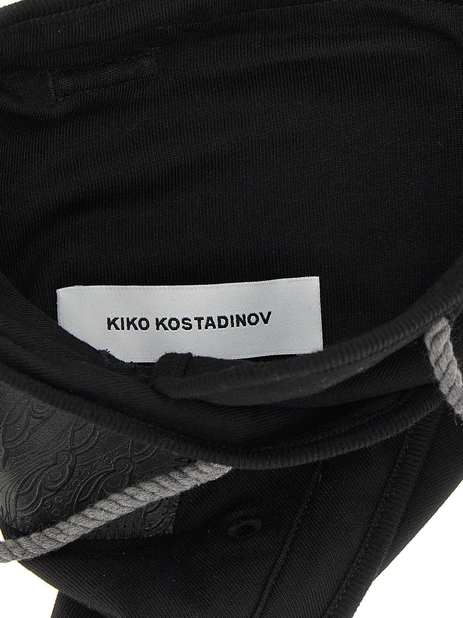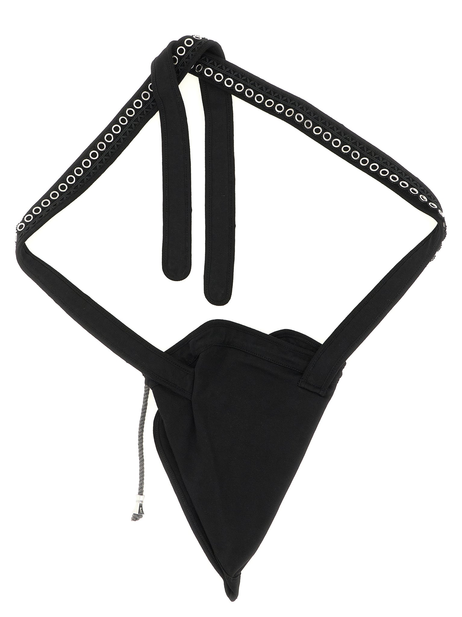 'hatha' heavy cotton jersey crossbody bag with conical shape with tone-on-tone leather patch and drawstring closure, Straps with perforated lace details and metal rivets to tie as desired. Size and Fit - W 25 x H 28 cm