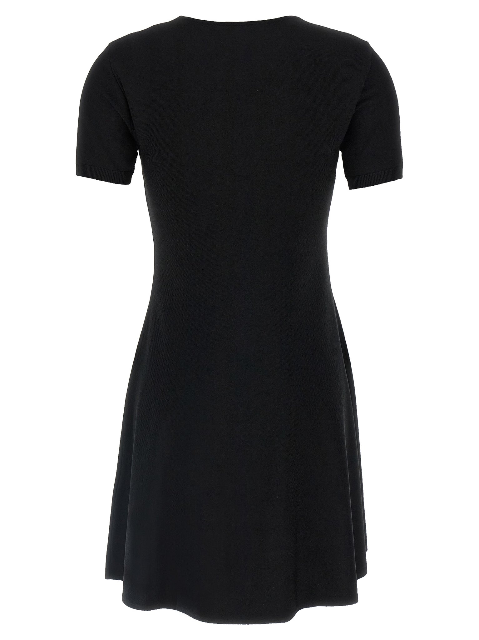 Solid stretch viscose mini dress, Hourglass silhouette with flared skirt, Front v-neck with contrast ribbed knit bow detail, And short sleeves. Size and Fit - true to size fitMade in: Italy