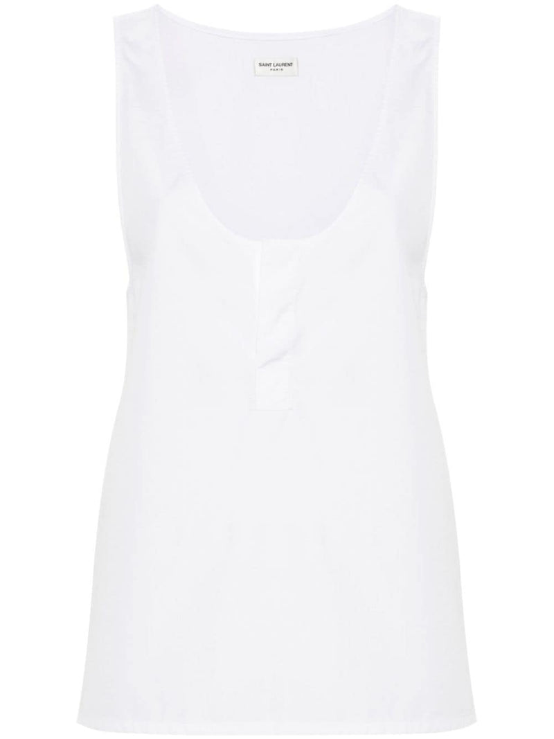 This sleeveless Saint Laurent top in white cotton poplin offers a U-neck, straight hem and a front button placket for a clean, versatile silhouette that dresses easily from day to night. The lightweight poplin provides breathable structure while the tailored cut maintains a refined profile for layering or wearing alone. Sized to fit true to size, the model is 1.75m / 5ft 8in and wears a size 36 (FR).