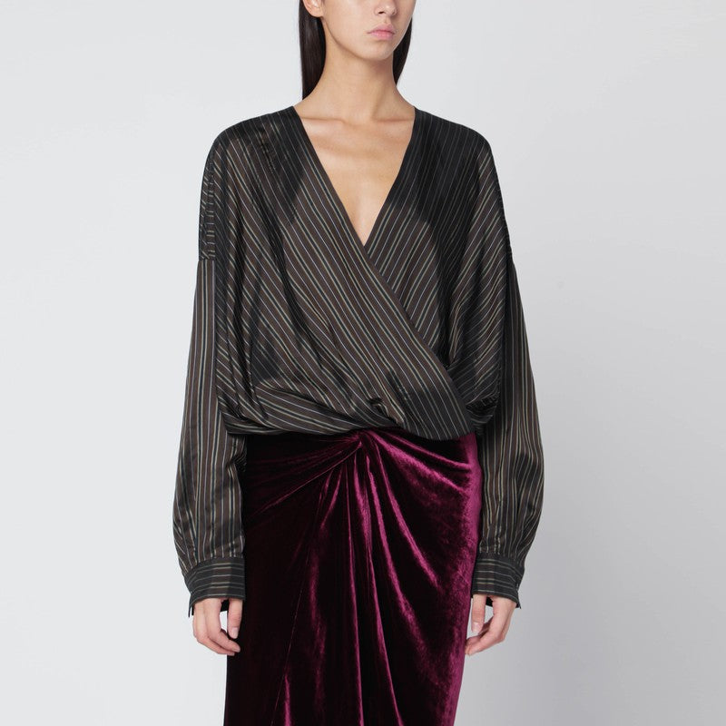 Brown wide shirt by Dries Van Noten with striped pattern, featuring a deep V-neck, long sleeves with buttoned cuffs, dropped shoulders, and a crossover design. Size and Fit - Model wears size X S Model measurements: Height: 178 cm Chest: 83 cm Waist: 63 cm Hips: 91 cm