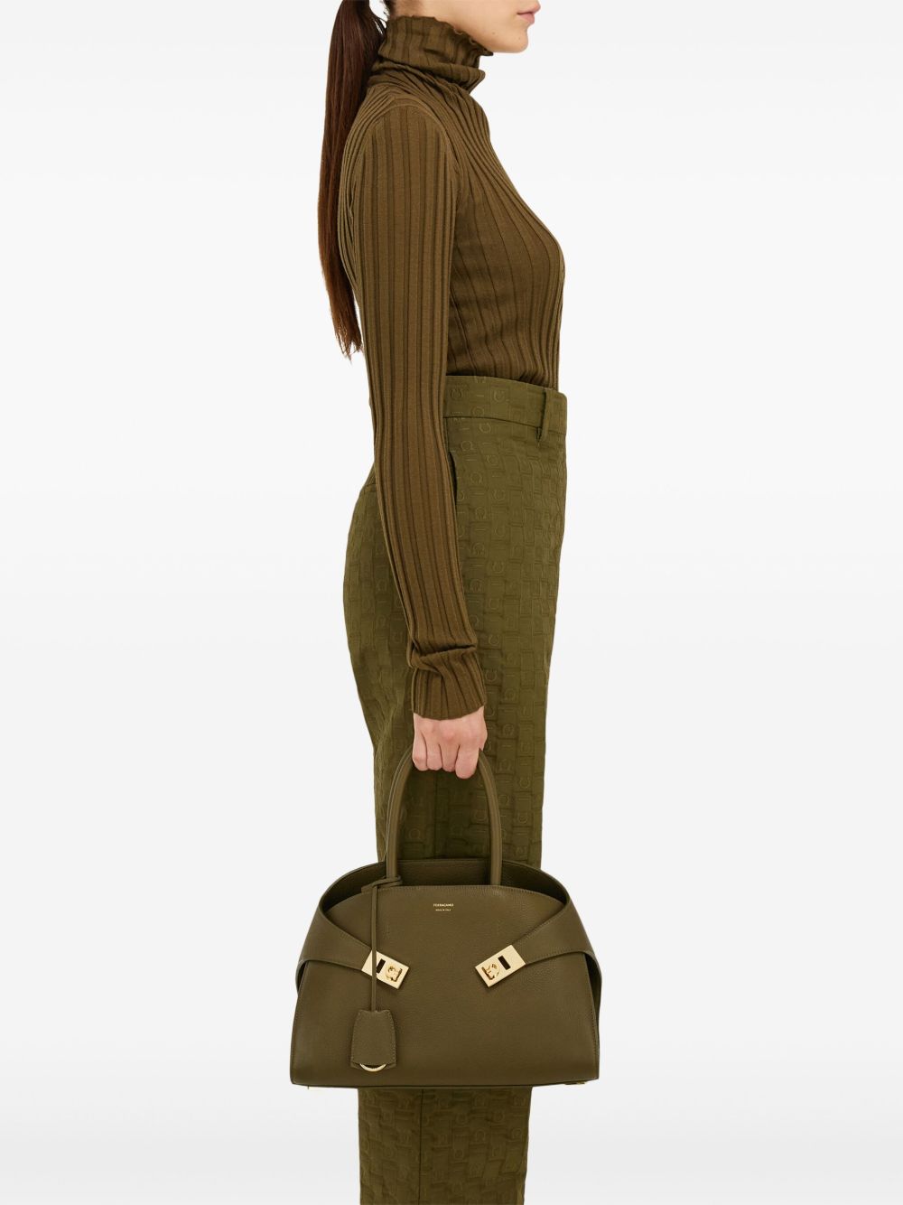 olive green lambskin grained texture ring fastening asymmetric design two top handles leather tag full lining main compartment internal zip-fastening pocket Hug small leahter tote bag