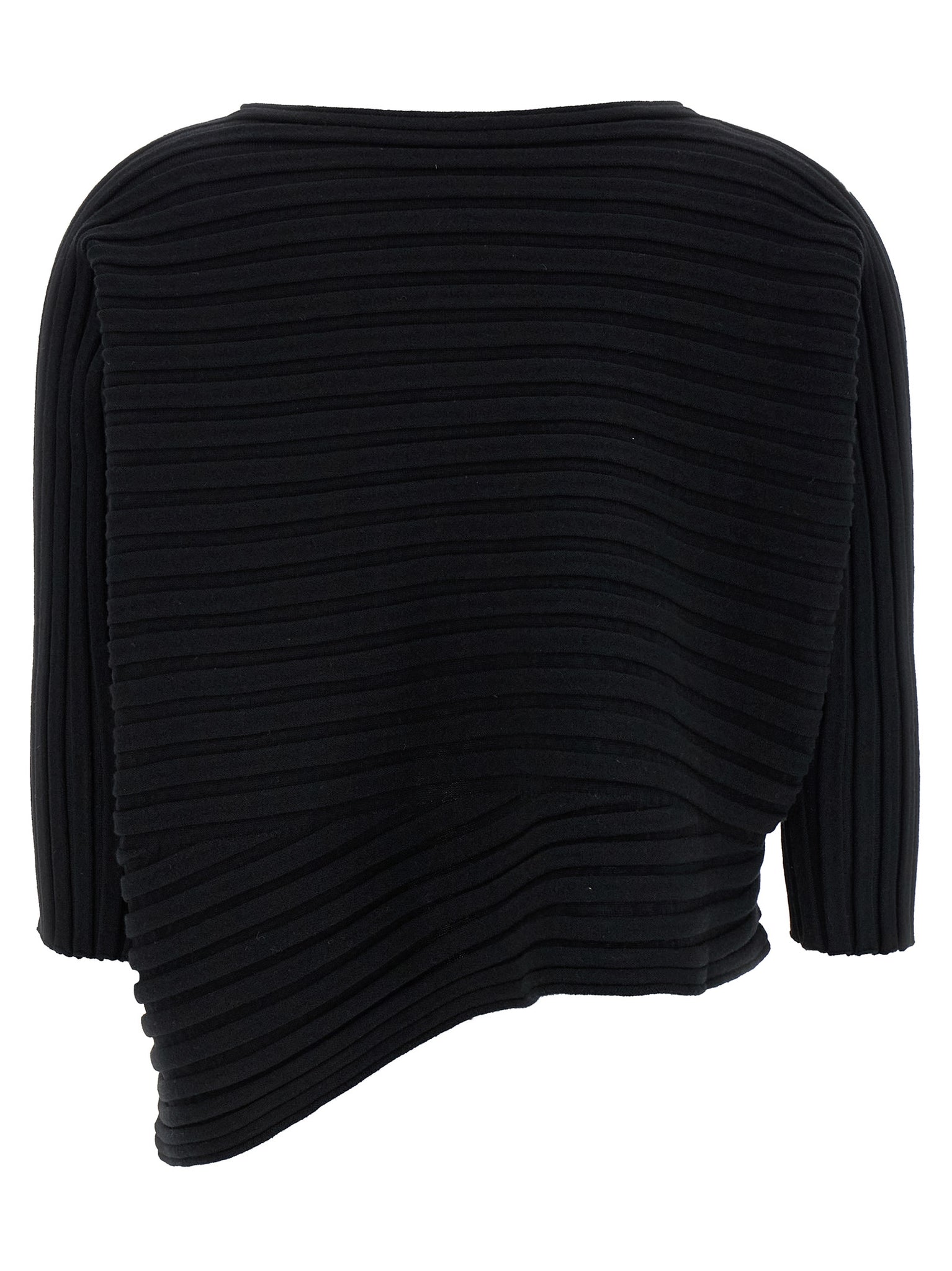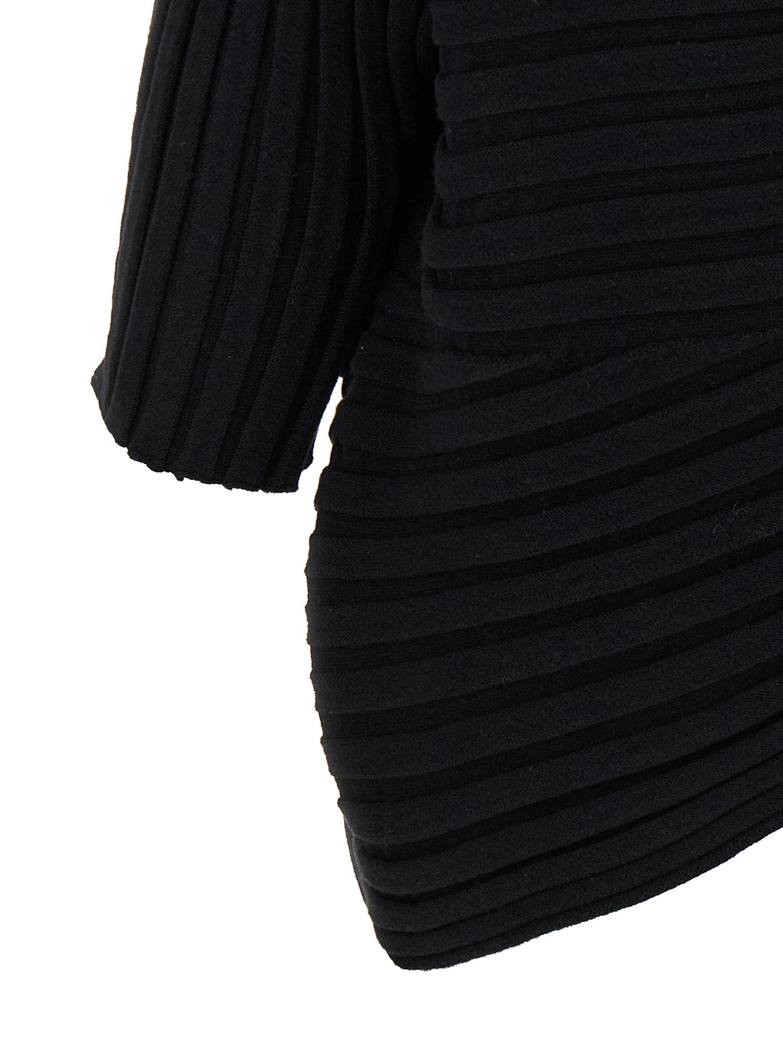 Discover a refined cotton-cashmere knit top from Issey Miyake offered in black with a unique straight silhouette formed by two contrasting knit structures. The piece features a round neckline, 3/4 sleeves, and an asymmetrical hem that ensures a modern drape and true-to-size fit. Ideal for transitional Fall wardrobes, it pairs easily with tailored trousers or layered over a long-sleeve tee for added warmth and texture.