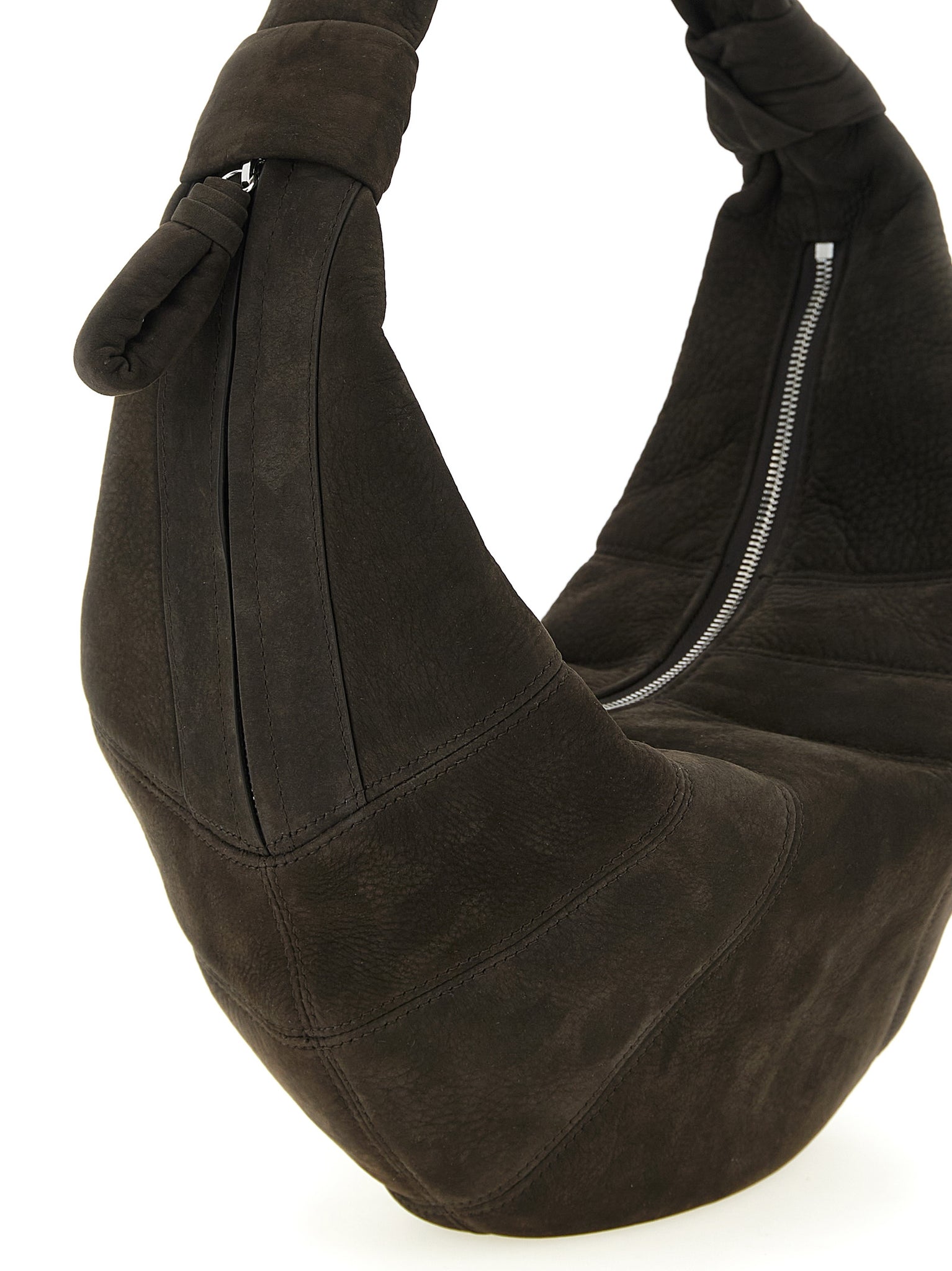 Fortune croissant' shoulder bag in nubuck alpaca with crescent silhouette with stitched panel construction, Cotton canvas lining, Top zip closure, Fixed handle with knot detail. Size and Fit - W 42 x H 23 x D 7 cmMade in: Spain
