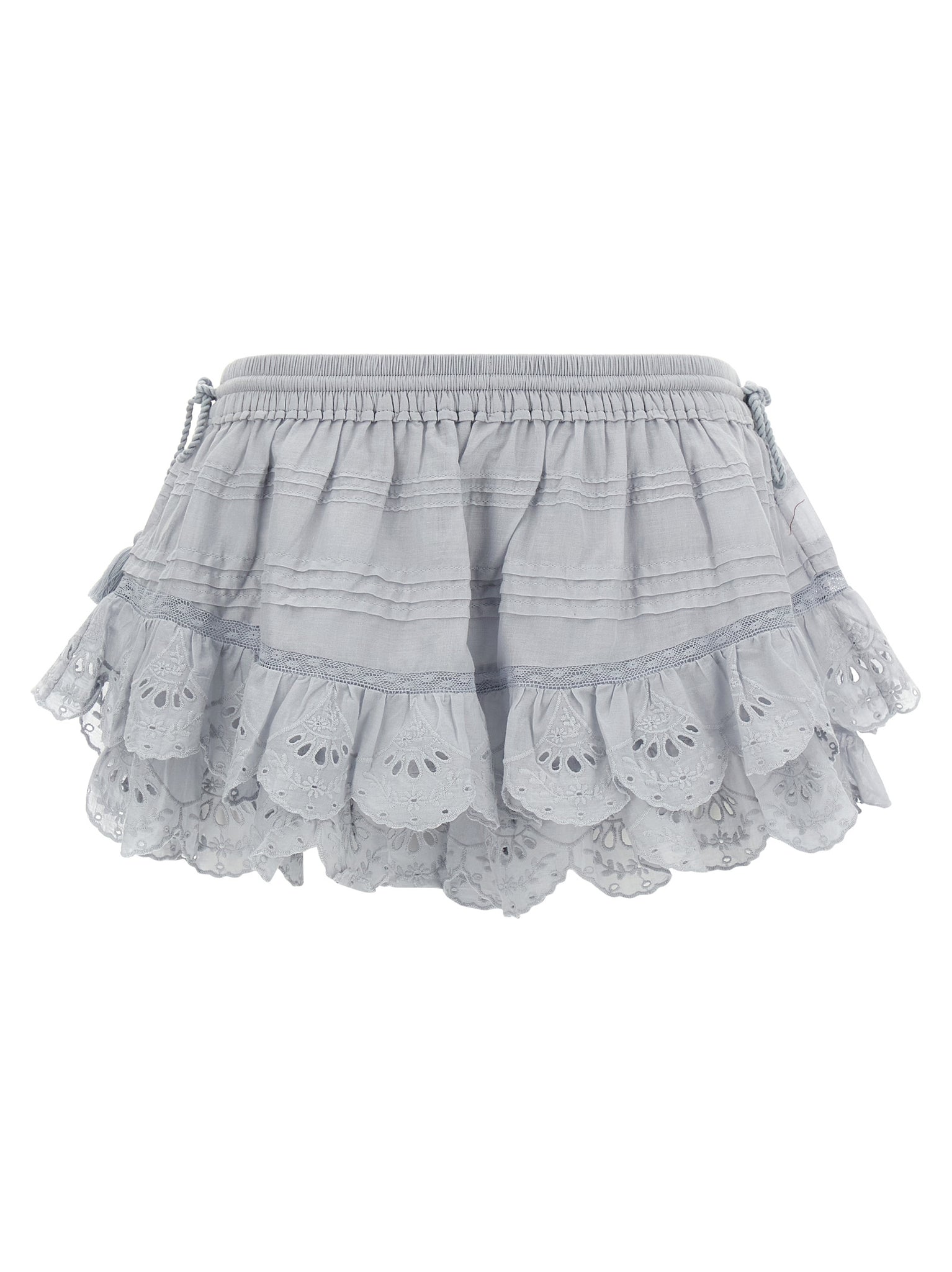 'puria' skirt-pattinatrice trouser shorts in cotton with ruffles, Floral lace and broderie inserts, Elastic waistband with drawstring and adjustable tassels knotted on the hips. Size and Fit - True to size fit french sizingMade in: India