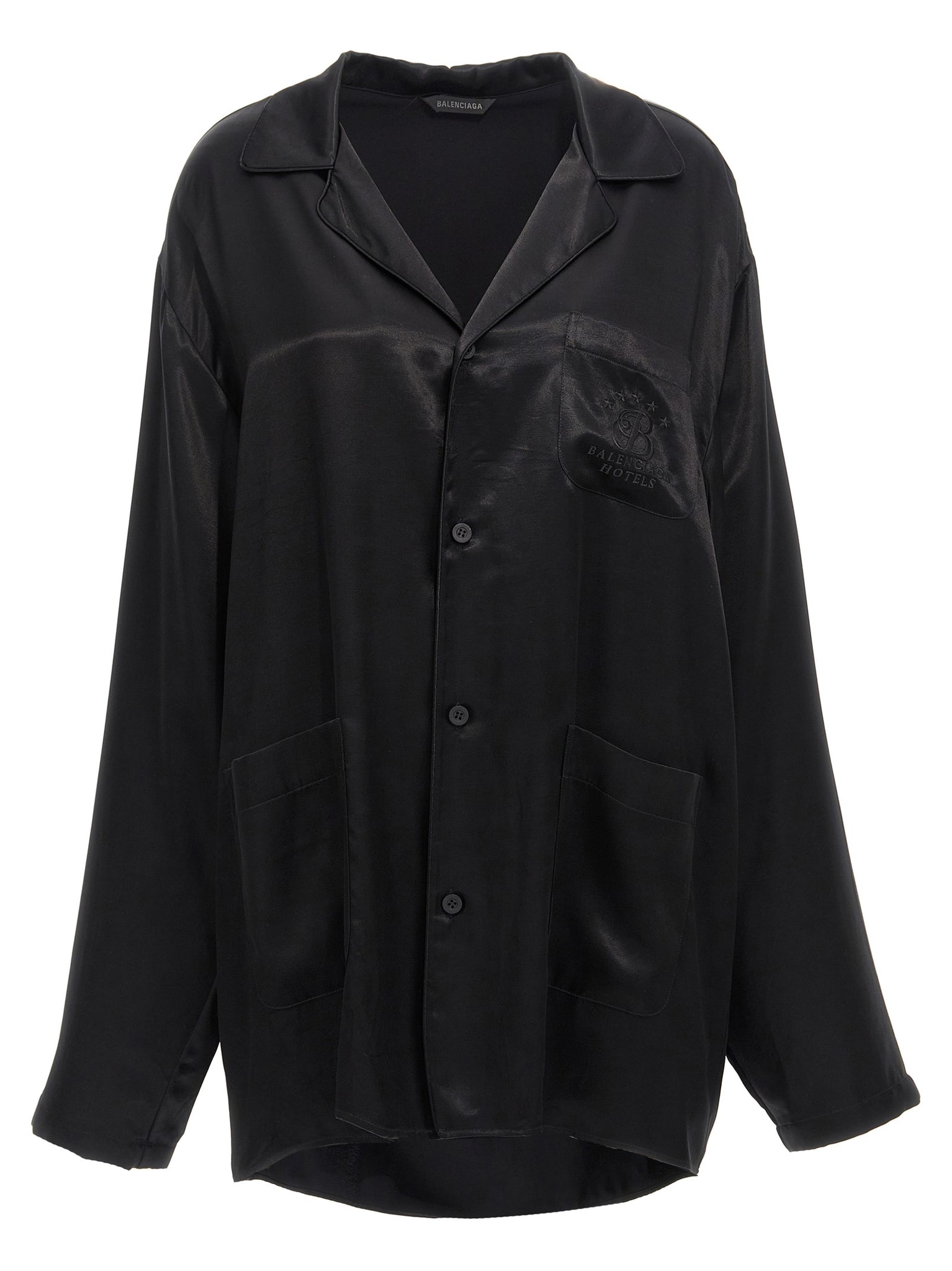 Viscose and cupro blend shirt, pajama model, pocket with tone-on-tone embroidered logo, button closure, long sleeves. Size and Fit - oversized fit French size