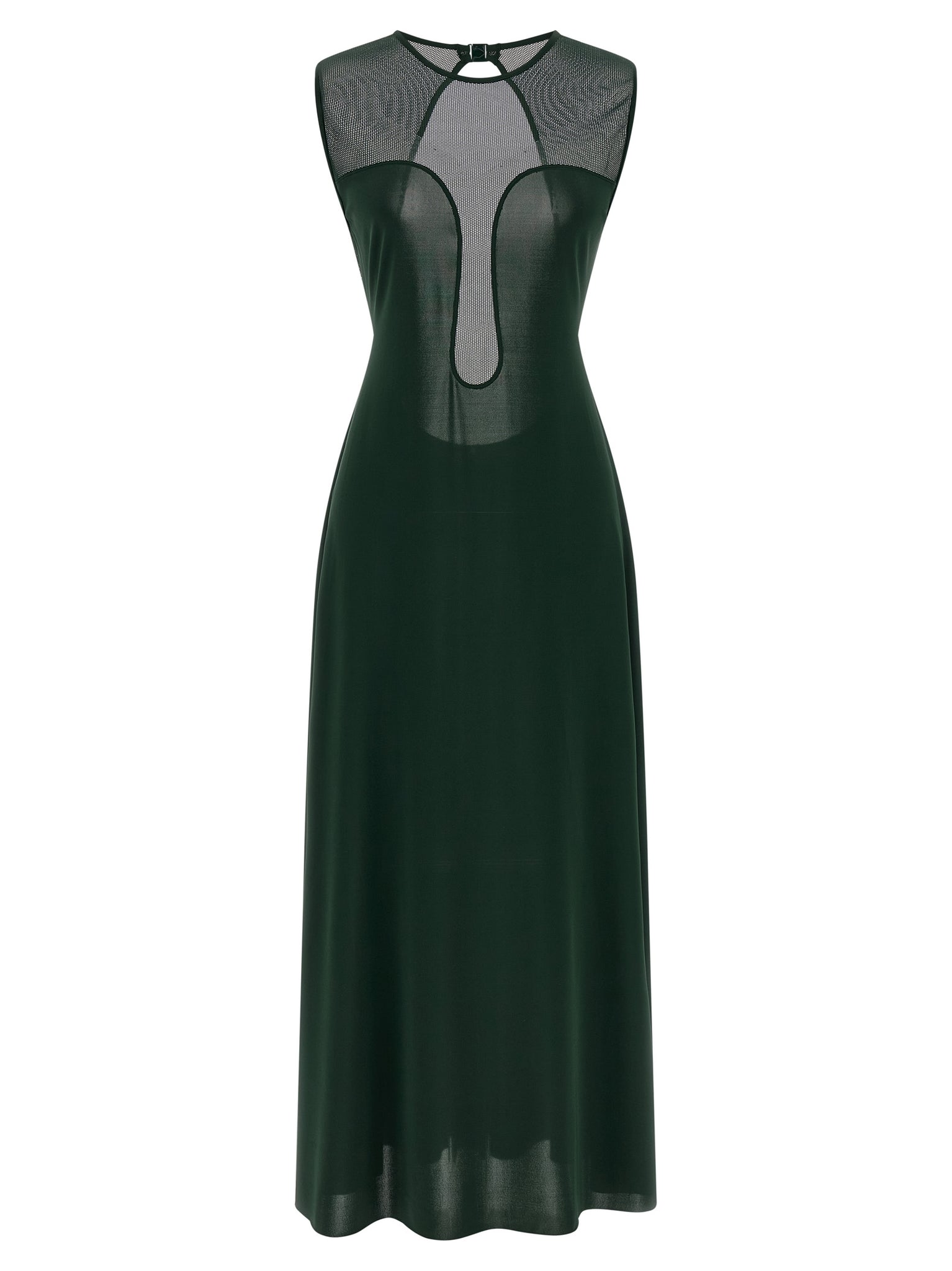 Discover a long, sleeveless stretch dress with a crew neck and mesh insert that balances coverage and airiness; the deep back neckline and clip closure create a refined silhouette. Designed for adults and true to size, this Green dress offers shaped support and easy movement for daytime or evening wear. Crafted by Eres, the piece blends functional stretch fabric with a clean finish for versatile styling.