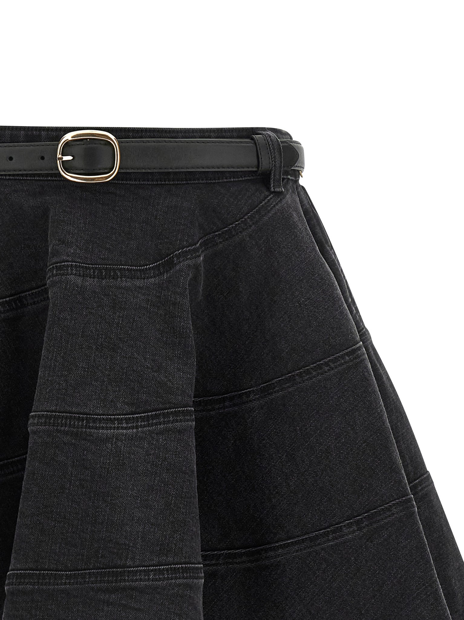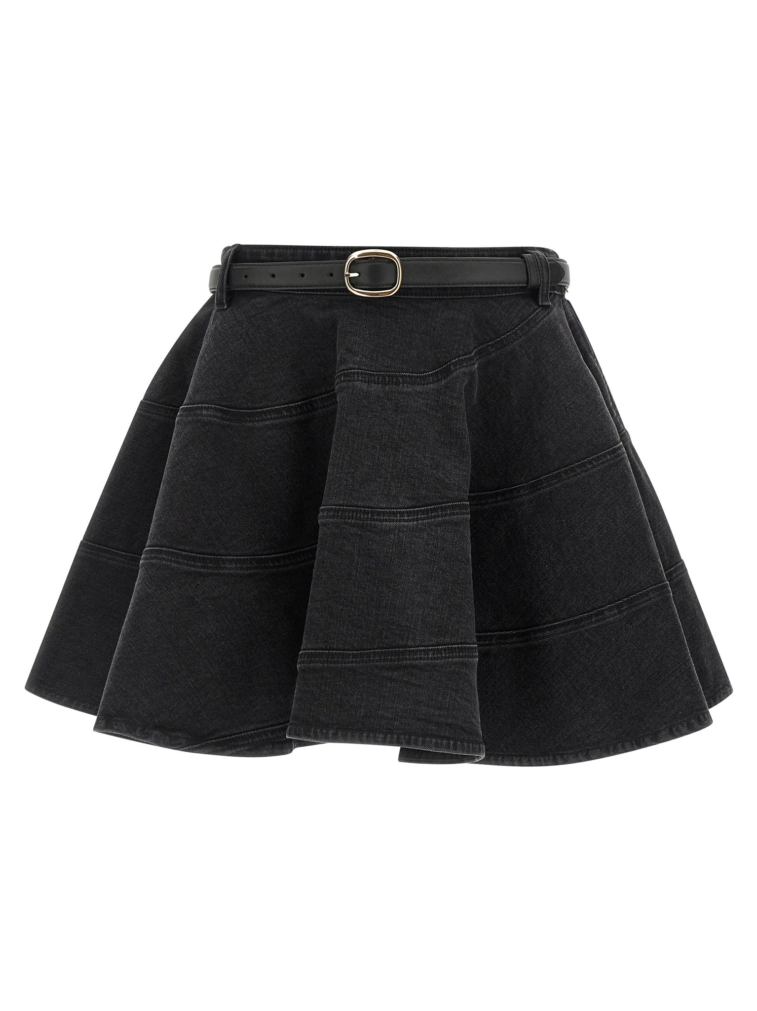 'Black Flared Denim Mini' cotton denim skirt with spiral stitching, flared silhouette, side zip closure, removable leather belt. Size and Fit - slim fit - UK size