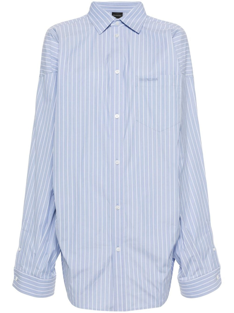 Discover a tailored long-sleeve shirt in clear blue and white poplin that combines a classic collar and buttoned cuffs with a subtly asymmetric hem for modern wearability. The chest logo and patch pocket add recognizable branding while the vertical stripe and cotton weave deliver breathable structure and easy layering. Ideal for refined casual looks, this piece balances comfort and signature design details without excess.