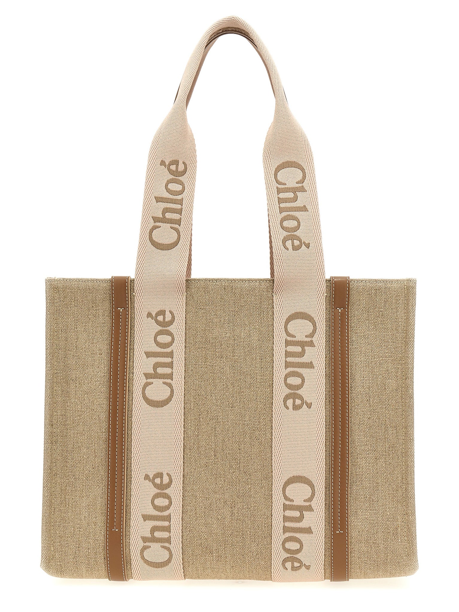 'Woody Medium' canvas shopping bag with leather details, logo handles. Size and Fit - W 37 x H 26 x D 12 cm