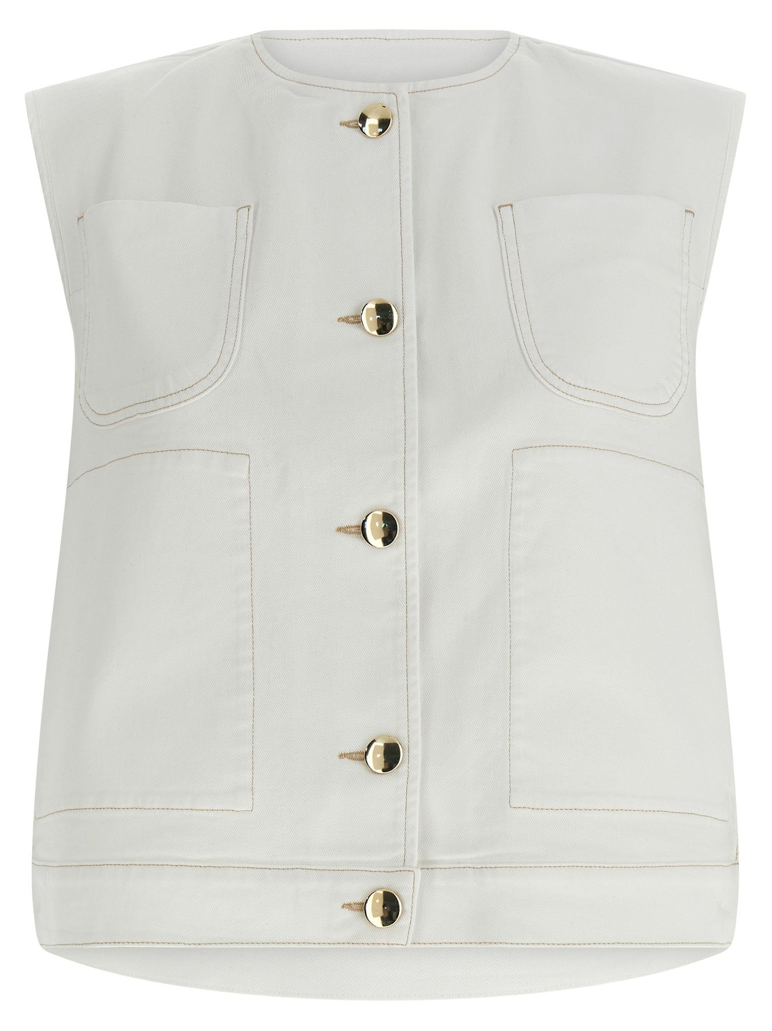 Discover a white Fabiana Filippi Denim And Knit Vest that pairs a cotton denim front with a soft knitted back for layered comfort and clean structure. The crew neck and front gold button closure create a refined silhouette while pockets and side slits with buttons add practical ease. True to size fit ensures predictable sizing and effortless pairing with tailored trousers or lightweight knits.