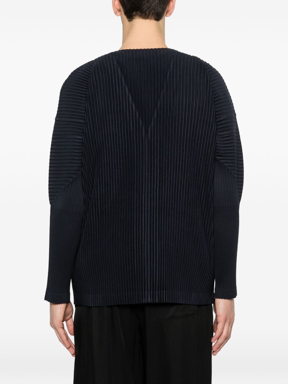 Discover a refined pleated v-necked cardigan from HOMME PLISSE' ISSEY MIYAKE in blue that offers tailored drape and easy layering for adult men. The design emphasizes lightweight structure and motion-friendly stretch, so it moves with you while maintaining a neat silhouette. Ideal for smart-casual wardrobes, this sweater balances comfort with a modern, architectural aesthetic.
