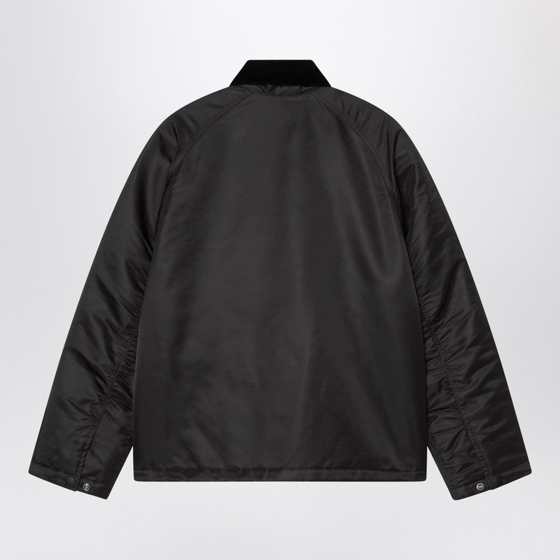 Carhartt WIP jacket in black waterproof nylon, featuring a quilted lining, double stitching, front button closure, adjustable cuffs, four front pockets, one with flap and button closure, corduroy collar, and square label on the chest. Size and Fit - Model wears size S Model measurements: Height: 179 cm Chest: 82 cm Waist: 65 cm Hips: 90 cm