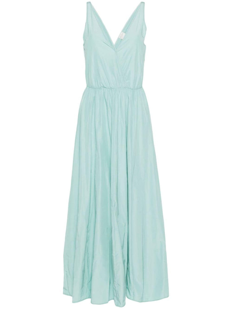 This sleeveless taffeta cocktail dress by Forte Forte in Clear Blue offers a V-neck, elasticated waistband and two inset side pockets for practical wear. It has tonal stitching, a curved hem and no lining, delivering structured shape with lightweight comfort. The piece fits true to size; the model is 1.75m (5ft 8in) wearing size 1.