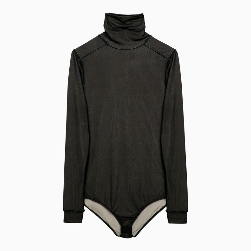 Black viscose jersey bodysuit from Maison Margiela featuring a high collar, long sleeves, a semi-sheer design, a press stud fastening and a white stitched logo on the back. Size and Fit - Model wears size 38 IT Model measurements: Height: 179 cm Chest: 82 cm Waist: 65 cm Hips: 90 cmMade in: Italy