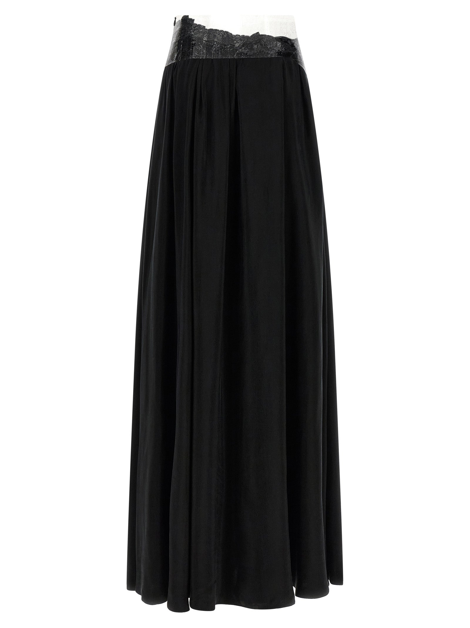Long 'taped' flowing cupro skirt with flared silhouette, Transparent ribbon waist with lace trim underneath, Side zip closure, Back 'four stitches'. Size and Fit - True to size fit