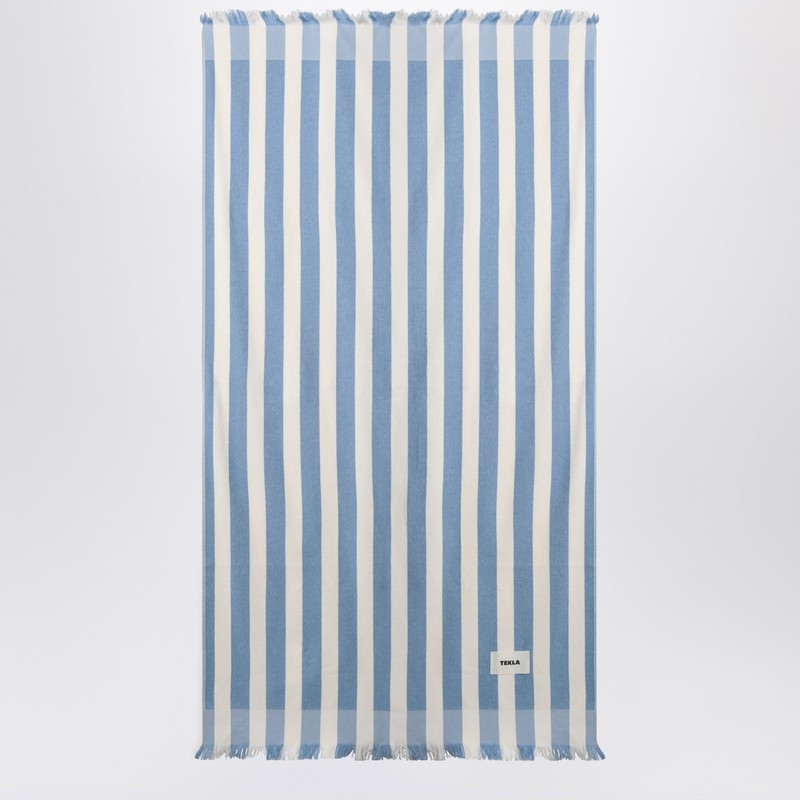 Organic cotton beach towel characterized by a striped pattern, label with logo and fringed hem.