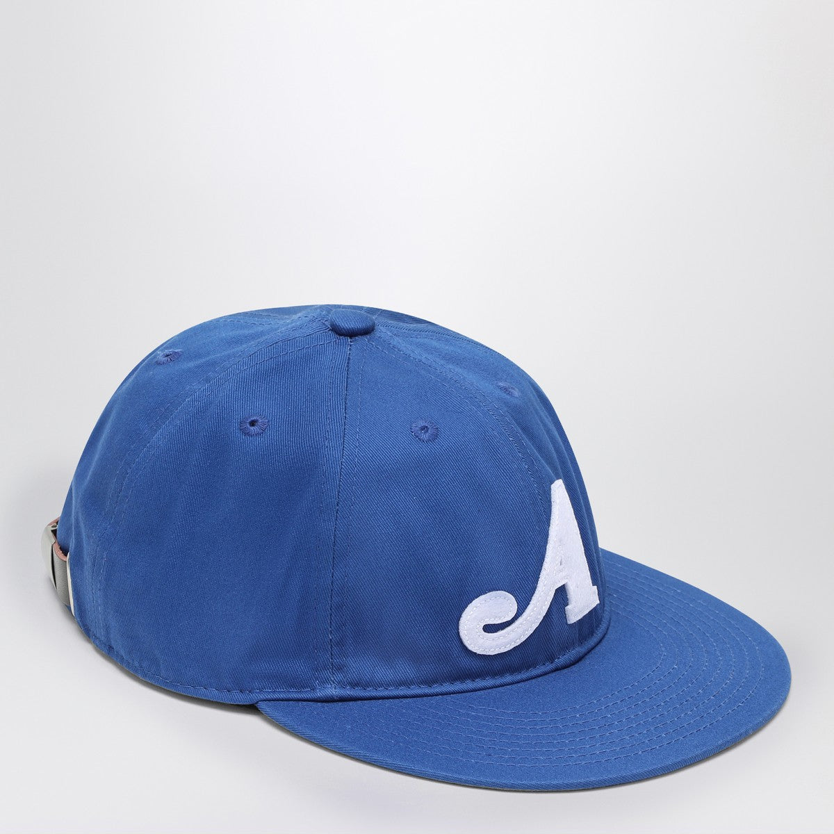 Navy blue cotton cap with visor by Awake NY, featuring logo embroidery on the front and back and an adjustable strap at the back.