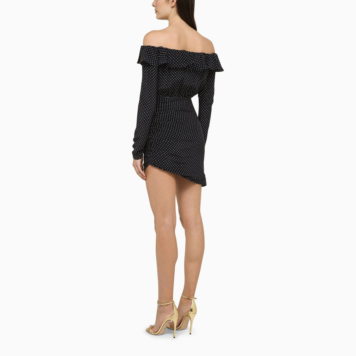 Navy blue silk mini-dress with white polka dots by Alessandra Rich, featuring open shoulders, long sleeves, buttoned cuffs and front ruffles. Size and Fit - Model wears size 40 IT Model measurements: Height: 177 cm Chest: 87 cm Waist: 67 cm Hips: 91 cm
