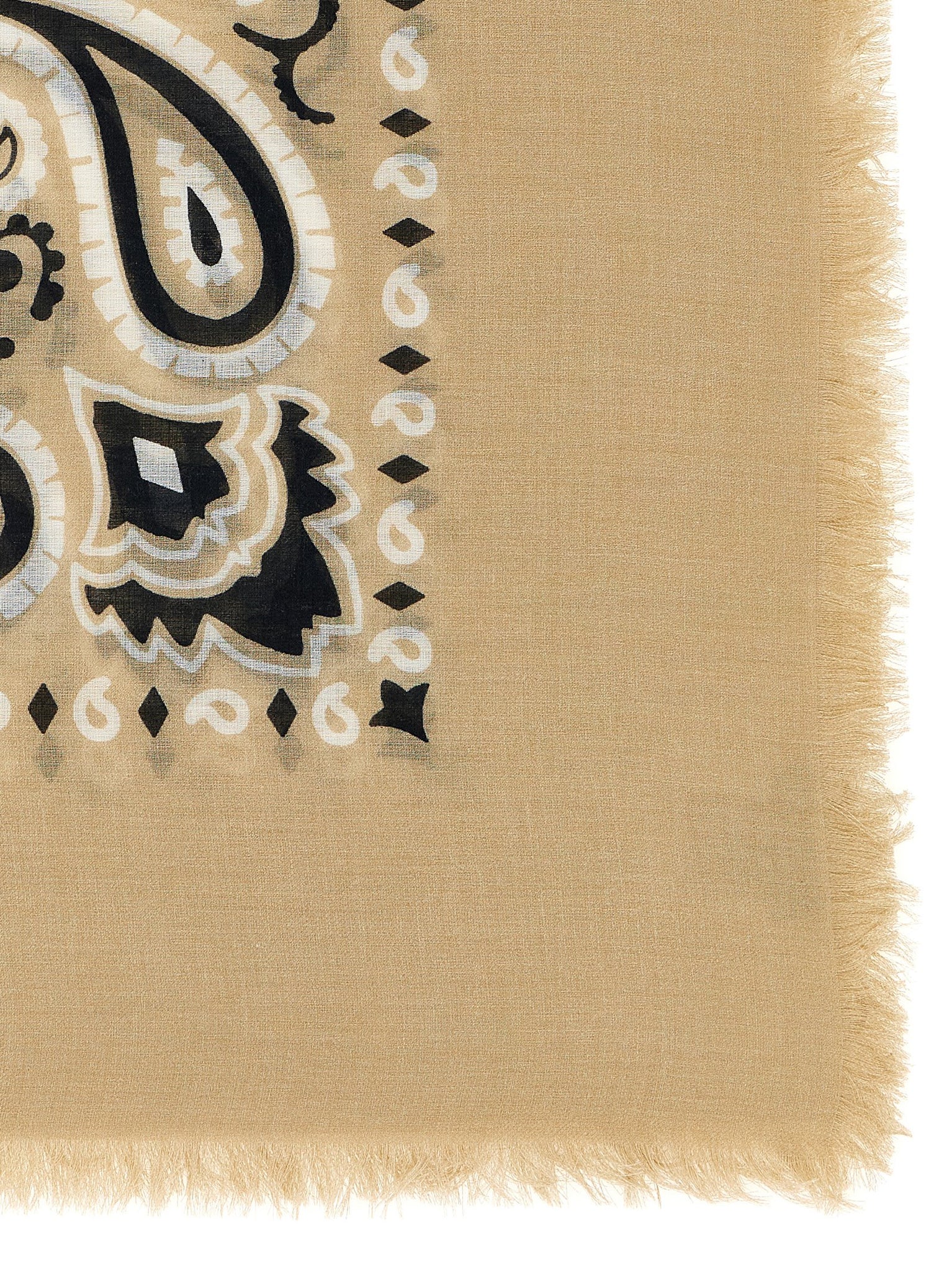 Stole in modal blend and cashmere with bandana print, fringes at the edges. Size and Fit - 140 x 140 cm