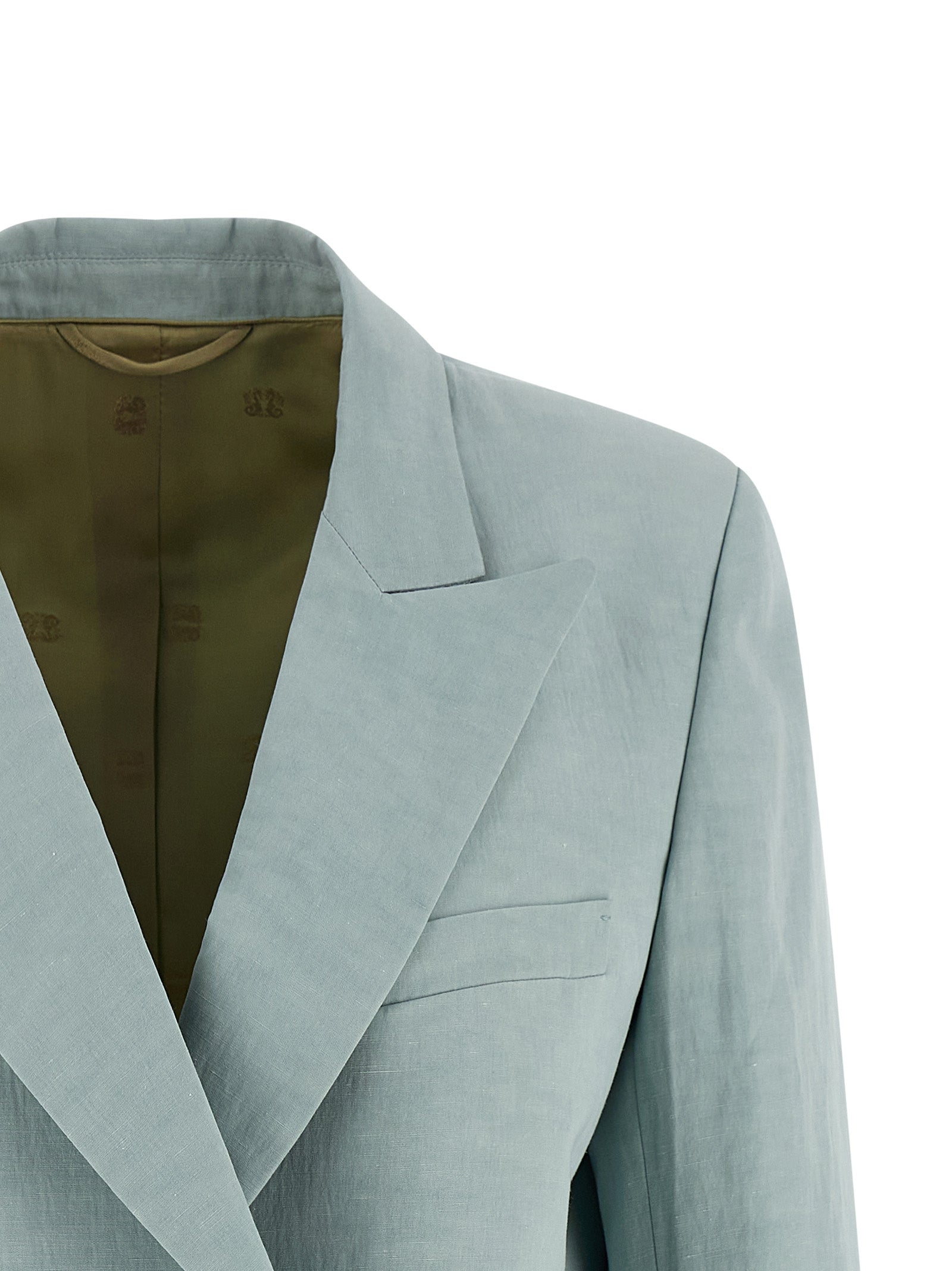 'Zenith Everynight' double-breasted silk and linen blazer with front shiny braided button closure, peak lapels, breast pocket, 'Smiley' pockets, four inner pockets, long sleeves, square shoulder with slightly padded shoulder straps, back vents, monogram viscose lining. Size and Fit - oversized fit