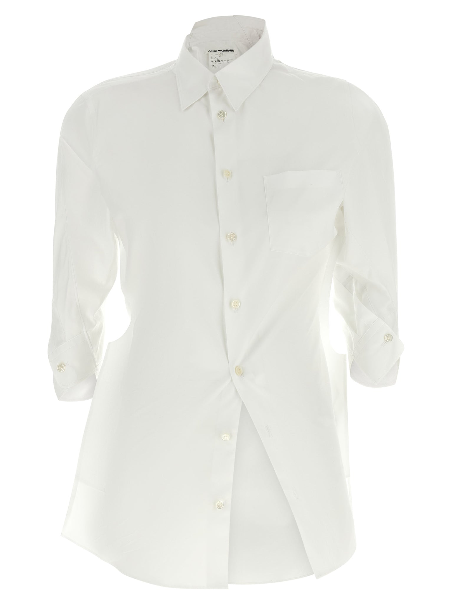 Cotton poplin shirt, Twisted asymmetrical construction, Disjointed collar, Breast pocket, Front mother-of-pearl button closure. 3/4 cuffed sleeves and asymmetrical hem.Made in: Japan