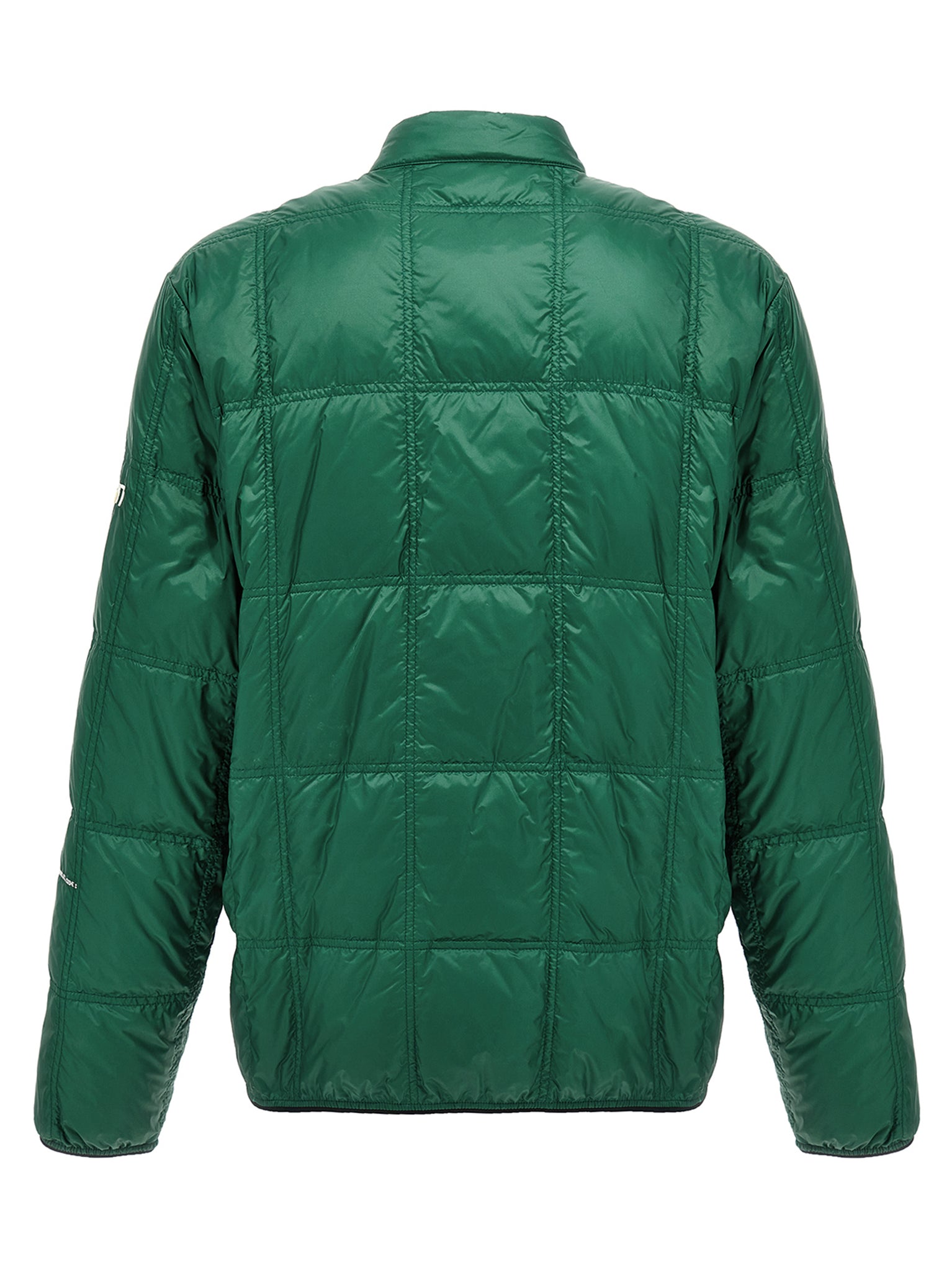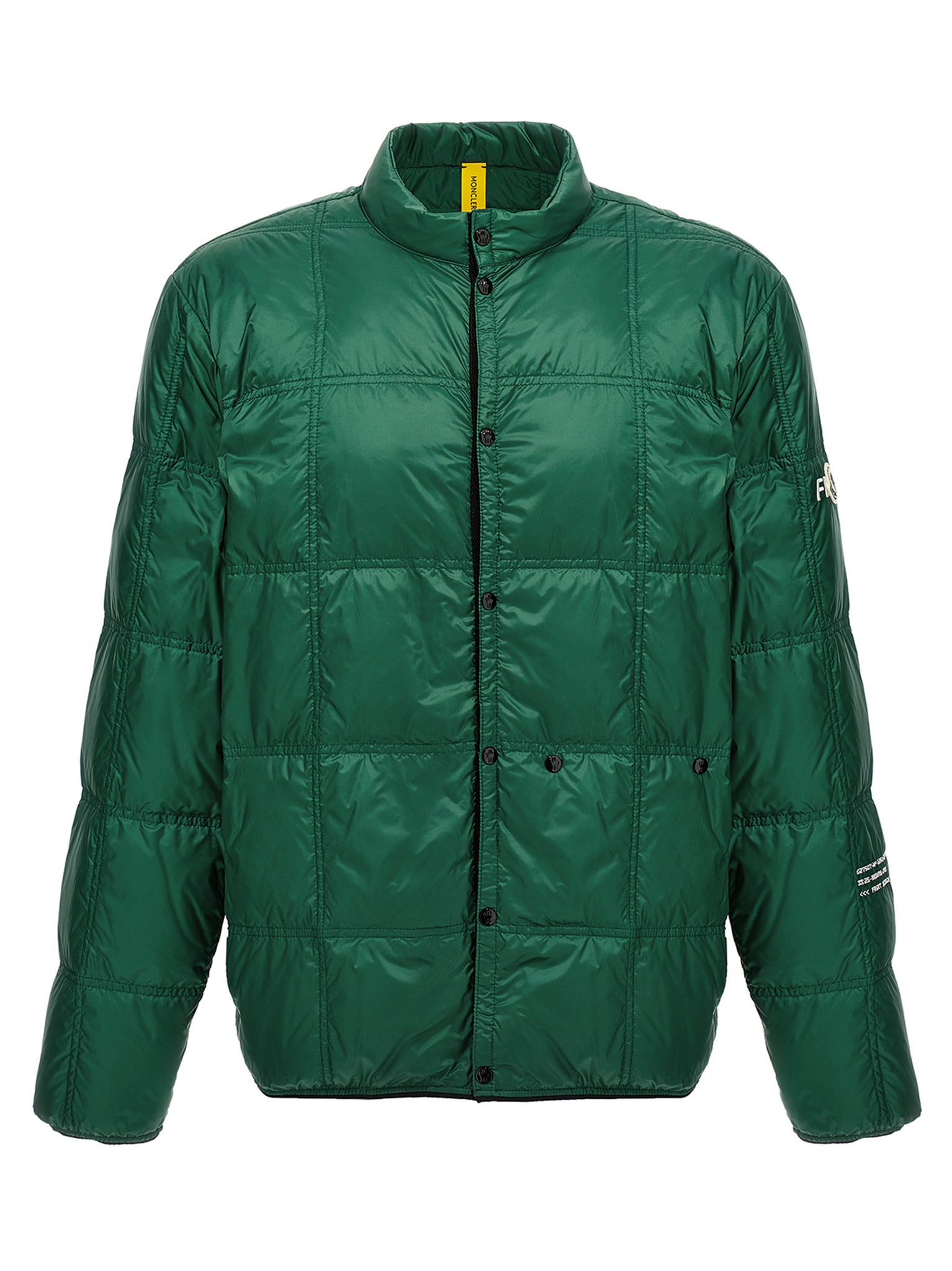 Moncler x FRGMT 'Jayel' down jacket in quilted saison longue slightly padded with feather, snap button closure, high neck, long sleeves with embroidery, felt logo patch, elasticized foldable hem pockets._x000D_ SUSTAINABLE: Product made with recycled materials. Size and Fit - Slim fit